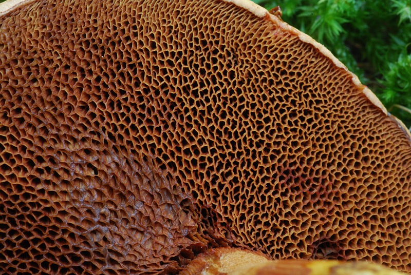 Chalciporus piperatus (Bull. : Fr.) Bataille. Regione Trentino. Settembre 2013. Foto di Tomaso Lezzi 3º Congresso trentino sui funghi alpini, Cles (TN), Loc. Malgaroi. Un particolare dei pori color cannella. - Ultima settimana