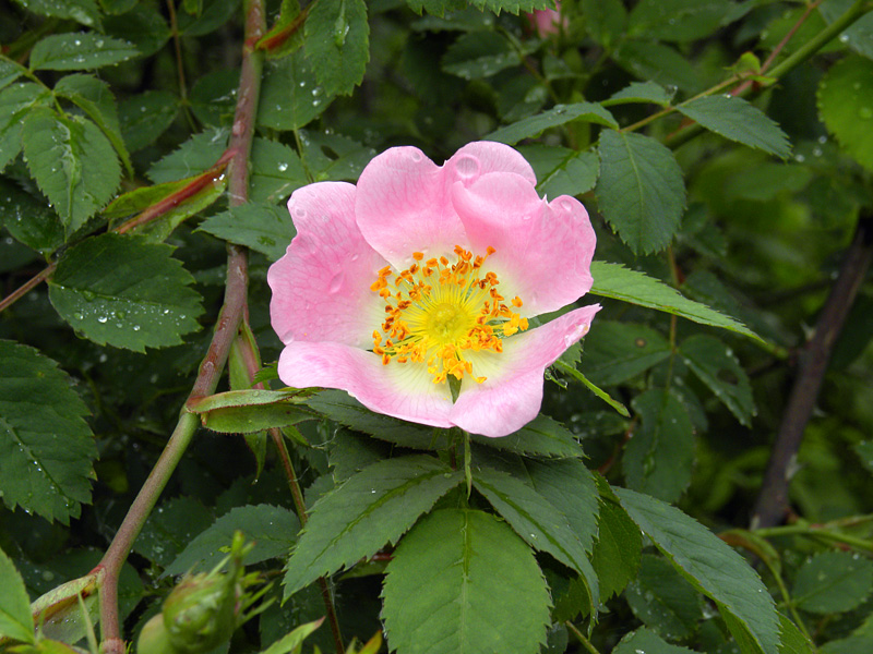 Arbusto perenne, molto ramificato e spinoso, con fusti di colore verdastro, robusti, eretti o arquati, con ceppo basale allargato, foglie verdi, picciolate e opposte, ovali o ellittiche, glabre, denticolate ai bordi, stipule e brattee dilatate e allungate, fiori solitari o in corimbi, grandi, di colore rosa o bianco-rosati, con stami liberi e numerosi, il frutto è una drupa ovoidale di colore rosso scuro. Fiorisce da maggio a luglio, da 0 a 1500 m s.l.m., in prati, boschi, campi incolti e arbusteti, presente in tutta Italia.