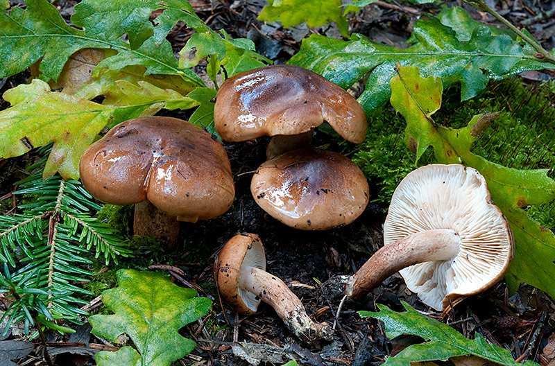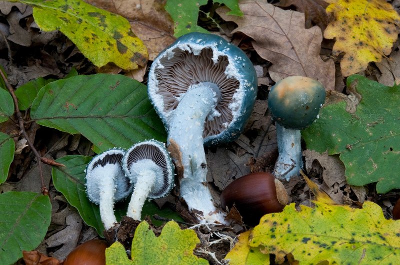 Cortinarius infractus Berk.; Regione Lazio; Novembre 2018; Foto e commento di Mario Iannotti. Cappello di colore grigio-bruno, ocraceo al centro, solcato da dense fibrille radiali. Lamelle abbastanza fitte, smarginate, di colore grigio-brunastro. Galbo cilindrico, clavato, all’apice di colore blu-violetto, fibrilloso. Carne amara, odore di patata cruda. Macroreazioni con KOH al 20% sulla cuticola inizialmente di colore verde-acquamarina poi vira dopo alcuni secondi al giallo intenso, sulla carne grigiastro. Microscopia Spore pruniforni, suglobose 6,7-7,5 x 5,4-6,2 µm. (Q = 1,3), decorate da verruche puntiformi concatenate. Nelle foto macro si può vedere in progressione come varia il colore della reazione con il KOH al 20% sulla cuticola dopo alcuni secondi. Microscopia Spore pruniforni, suglobose 6,7-7,5 x 5,4-6,2 µm. (Q = 1,3), decorate da verruche puntiformi concatenate. -