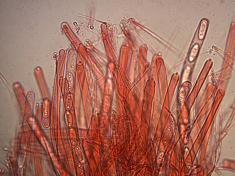 Sarcoscypha coccinea (Scop.: Fr.) Lambotte; Regione Umbria; Marzo 2018; Foto, descrizione e microscopia di Mario Iannotti. Quando fruttifica è impossibile non scorgere questo ascomicete, emerge dal terreno brullo di questo periodo tardo invernale con il suo colore molto appariscente rosso scarlatto. Si presenta con il suo habitus tipico a forma di tazza, il bordo finemente frastagliato, munita di un piccolo pseudostipite con il quale si attacca a rametti marcescenti di latifoglia caduti nel terreno. Questa raccolta fruttificava su rametti di Olmo. Microscopia Spore cilindrico-ellissoidali, con estremità ottuse, lisce, nude, prive di rivestimento gelatinoso e di calotte polari, contengono molte piccole guttule, misure 27,7-38,6(40,2) × 8,9-13 µm. Aschi, ottosporici, settati alla base. Parafisi sottili, cilindriche, settate, ramificate, con contenuto granulare rossastro. Excipulum ectale formato da una textura prismatica, con peli flessuosi, cilindrici, settati, a parete spessa, ialini. Microscopia Aschi, ottosporici, settati alla base. Osservazione in Rosso Congo anionico a 100×. Osservazione in Rosso Congo anionico a 400×. Osservazione in Rosso Congo anionico a 1000×. Parafisi sottili, cilindriche, con apice leggermente ingrossato, settate, ramificate, con contenuto granulare rossastro. Osservazione in Rosso Congo anionico a 400×. Osservazione in Rosso Congo anionico a 1000×. Spore cilindrico-ellissoidali, con estremità ottuse, lisce, nude, prive di rivestimento gelatinoso e di calotte polari, contengono molte piccole guttule, misure 27,7-38,6(40,2) × 8,9-13 µm. Osservazione in Rosso Congo anionico a 1000×. Osservazione in acqua a 1000×. Excipulum ectale formato da una textura prismatica, con peli flessuosi, cilindrici, settati, a parete spessa, ialini. Osservazione in acqua a 400×. Osservazione in Rosso Congo anionico a 400×. -