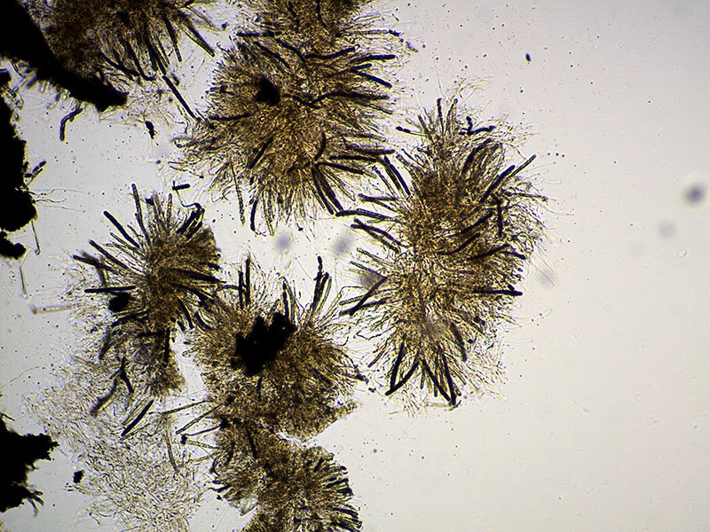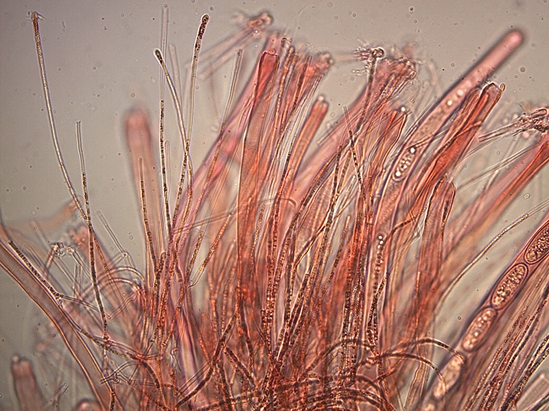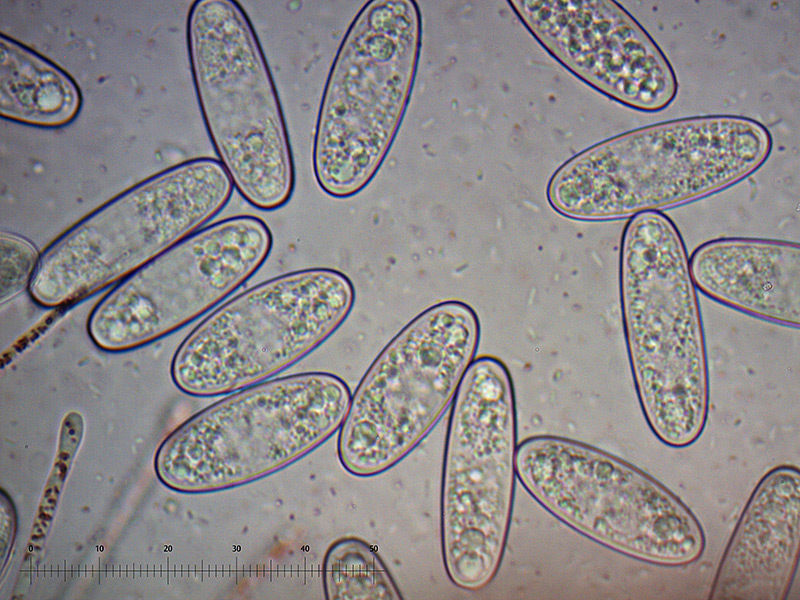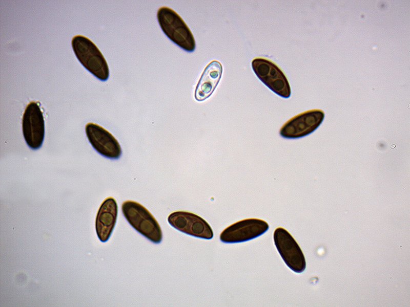 Hypoxylum fuscum (Pers.) Fr.; Regione Lazio; Aprile 2018; Foto, descrizione e microscopia di Mario Iannotti. Ascoma formato da uno stroma di forma arrotondata, pulvinata, di colore viola, vinaccia, marrone-violaceo, in vecchiaia si scurisce su toni nerastri, superficie ruvida, con i periteci di forma globosa o ovoidale e l’ostiolo al di sotto della superficie stromatale. Dallo stroma è possibile estrarre con KOH al 10% dei pigmenti che in questa specie sono di colore citrino, olivacei o terra d’ombra diluita. Molto comune su legno o rami a terra di Corylus ma anche di altre latifoglia quali, Alnus, Betula e Carpinus. La presente raccolta vegetava sulla corteccia di un rametto a terra di Corylus avellana. Vi sono altre specie simili ma differiscono per avere le spore di dimensione notevolmente più piccole e per il diverso colore del pigmento, in particolare, Hypoxylon carneum differisce per avere pigmenti violacei, Hypoxylon petriniae ha pigmenti arancioni e Hypoxylon vogesiacum per non avere pigmenti estraibili. Hypoxylon macrosporum è tipico delle latitudini nordiche, artico-alpine, ha un rapporto di specificità per il Salix, ha spore molto più grandi. Hypoxylon macrocarpum differisce per le dimensioni più grandi degli stroma che hanno una lucentezza metallica, le spore più piccole e per l'odore aromatico. Hypoxylon perforatum si separa per avere gli ostioli solitamente circondati in modo evidente da un anello di sostanza bianca di 60-120 μm di diametro e spore più piccole. Hypoxylon fragiforme si caratterizza per avere gli stroma emisferici color ruggine e pigmenti estraibili arancioni con il KOH, crescita tipicamente su Fagus sp.. Microscopia Spore di colore marrone, ellissoidali, asimmetriche, con estremità strettamente arrotondate, mono e biguttulate, con fessura germinativa longitudinale a maturità, misure 12,2-14,99 × 5,34-6,52 μm - Qm 2.3. Aschi cilindrici, amiloidi, ialini, uniseriati, ottosporici, misure 101-165 x 7-12 μm. Bibliografia BREITENBACH, J. & KRÄNZLIN, F., 1984. Champignons de Suisse. Ascomycetes. Vol. 1. Lucerna. Ed. Verlag Mykologia. Fonti Internet http://pyrenomycetes.free.fr [Data di accesso: 04/05/2018]. Particolare dei periteci Pigmenti estratti con KOH al 20% di colore terra d'ombra diluita. Microscopia Aschi cilindrici, amiloidi, ialini, uniseriati, ottosporici, misure 101-165 x 7-12 μm. Osservazione in Melzer a 100×. Osservazione in Melzer a 400×. Osservazione in Melzer a 1000×. Spore di colore marrone, ellissoidali, asimmetriche, con estremità strettamente arrotondate, mono e biguttulate, con fessura germinativa longitudinale a maturità, misure 12,2-14,99 × 5,34-6,52 μm - Qm 2.3. Osservazione in acqua distillata a 1000×. -