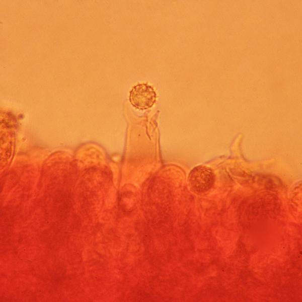 Laccaria affinis (Singer) Bon spore sferiche di 9-9.5 µm con aculei mediamente spaziati lunghi circa 1 µm -