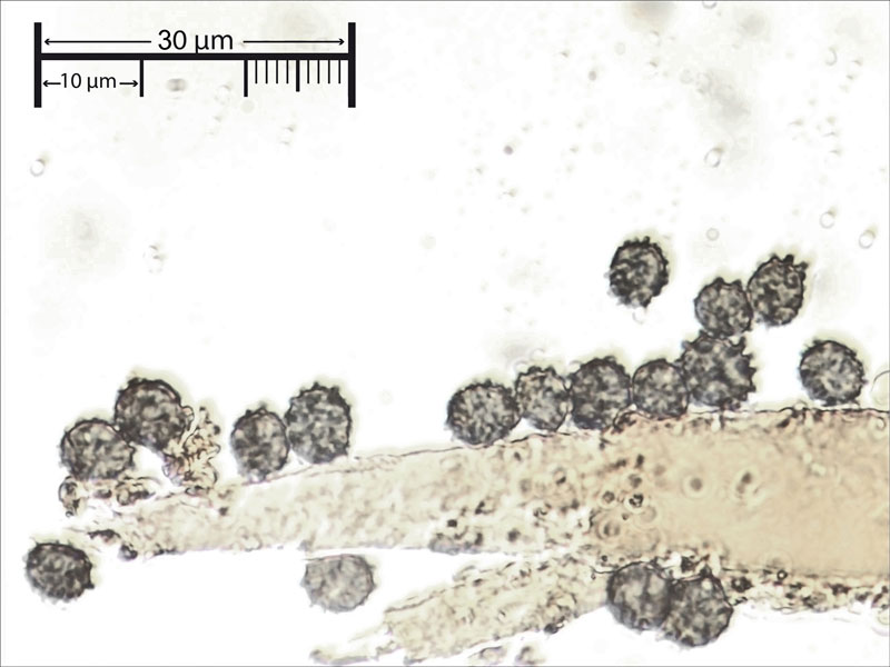 Lactarius acris (Bolton: Fr.) Gray Spore N° Long. Larg. Q Moy 7,50 6,25 1,21 Min 6,64 5,17 1,07 Max 8,73 7,42 1,35 Media 7,47 6,10 1,20 Lxl: N = 16; dMd; (6,64)6,64-7,165-8,50(8,73) x (5,17)5,23-6,04-7,36(7,42) Qm = 1,21 -