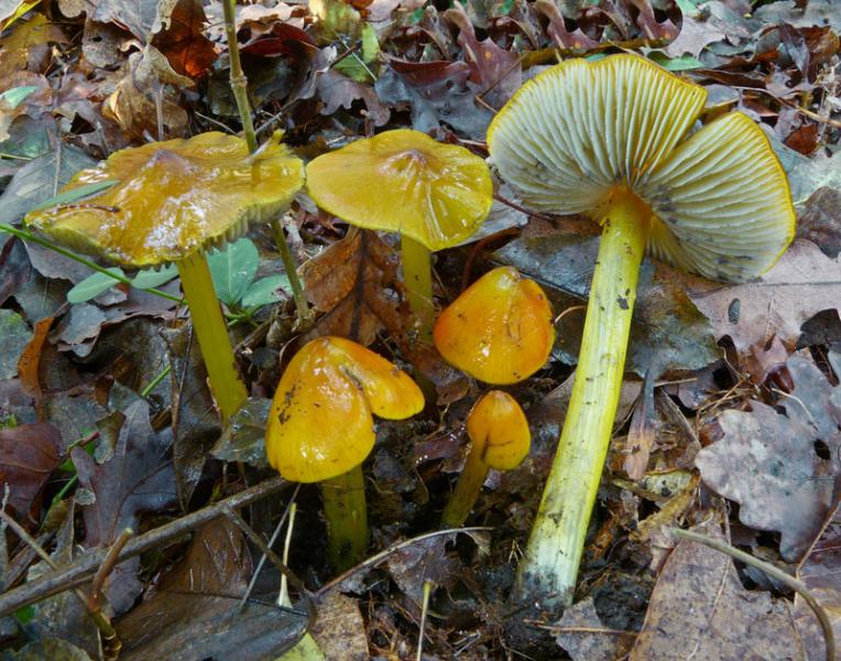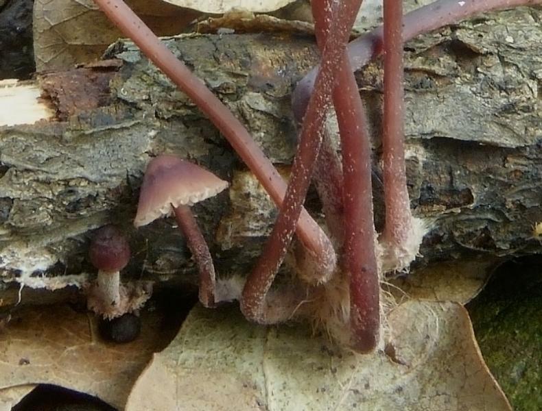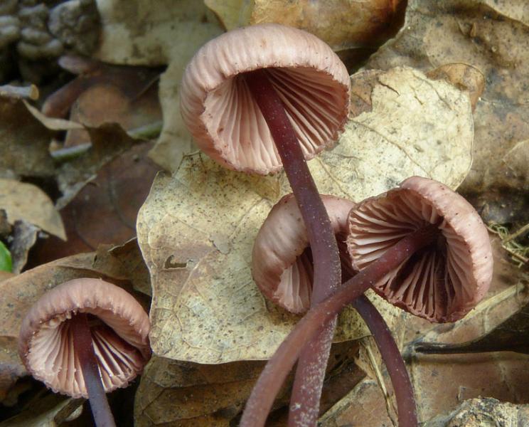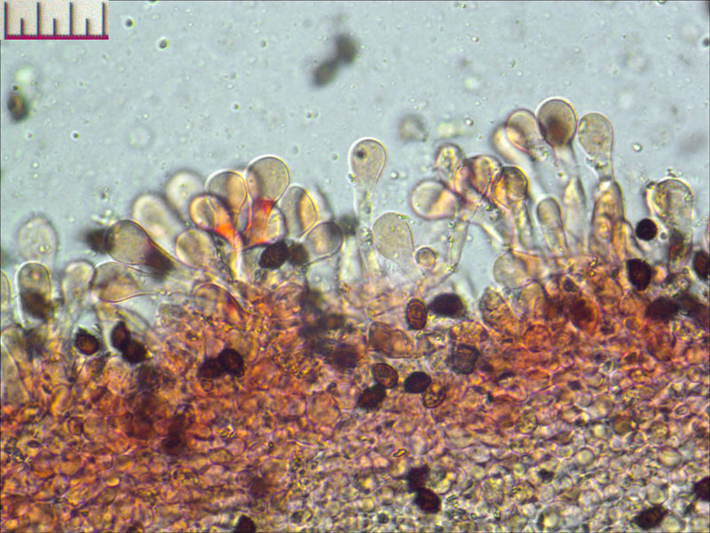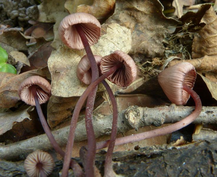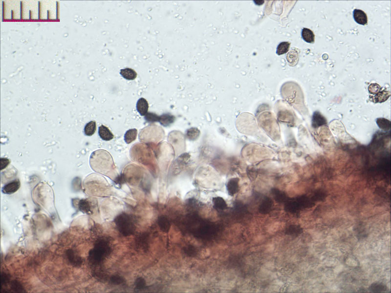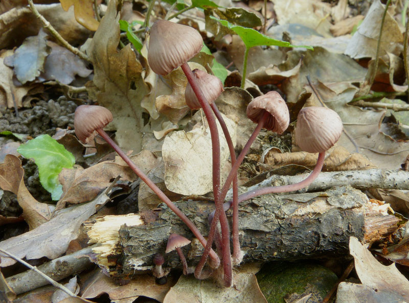 Su tronco in decomposizione di Quercia. Mycena inclinata (Fr.) Quèl. Mycena con aspetto molto variabile, si riconosce sul campo per l'habitat lignicolo con preferenza per Quercia sp., il gambo che diventa bruno rossastro, il sapore leggero di farina rancida Microscopicamente presenta spore largamente ellissoidali e cheilocistidi clavati o subcilindricicon escrescenze ramificate. Spore N° Long. Larg. Q Moy 8,48 5,75 1,48 Min 7,98 5,26 1,20 Max 9,77 6,77 1,68 media 8,27 5,63 1,48 Cheilocistidi clavati con escrescenze ramificate