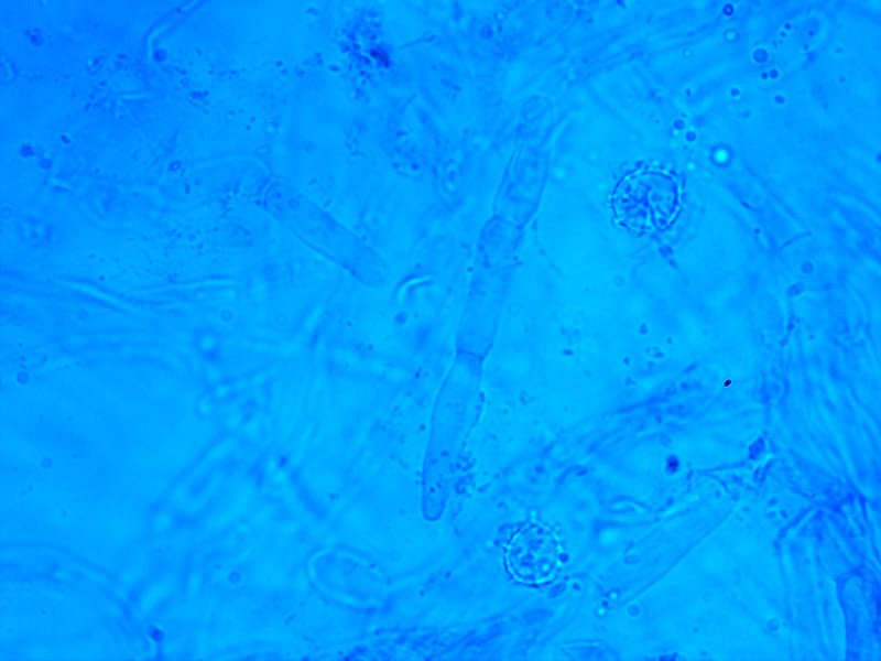 Russula insignis Quél.; Regione Toscana; Ottobre 2019; Foto di Tomaso Lezzi. Specie appartenente al Sottogenere Ingratula, Sezione Subvelatae. È una delle sole 4 specie italiane che mostra un velo giallo alla base del gambo che arrossa immediatamente a contatto con le basi forti (KOH oppure NaOH), oppure con Ammoniaca, che è una base debole, in questo caso il velo arrossa, ma in maniera meno intensa. Le altre specie europee che possiedono velo sono Russula ochroleuca e Russula viscida entrambe appartenenti alla sezione Viscidinae e Russula messapica appartenente alla sezione Messapicae. Questa raccolta è stata effettuata sotto Leccio e Pinus pinea, la sporata è crema chiaro, IIa-b. Reazione con KOH alla base del gambo, dove è presente velo giallo, e conseguente viraggio al rosso. Particolare della reazione con KOH alla base del gambo, dove è presente velo giallo, e conseguente viraggio al rosso. Spore. Osservazione in Melzer con lavaggio in Cloralio idrato; 1000×. Cuticola. Osservazione in Blu di Toluidina; 1000×. -