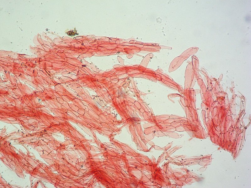 Lepiota cristata (Bolton : Fr.) P. Kumm.; Regione Marche; Ottobre 2019; Foto di Tomaso Lezzi. Cuticola ad imeniderma. Osservazione in Rosso Congo; 400×. Chilocistidi clavati. Osservazione in Rosso Congo; 400×. Spore a forma di proiettile (speronate). Osservazione in Rosso Congo; 400×. -