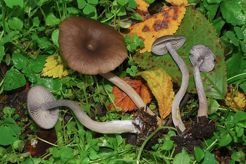 Lyophyllum rhopalopodium Clémençon; Regione Abruzzo; Ottobre 2019; Foto di Tomaso Lezzi. XXVI Convegno GEMA 2019, Taxa e cenosi fungine nell’area del mediterraneo Lyophyllum appartenente alla Sezione Semitalina, Sottosezione Goniosporina, con viraggio delle lamelle prima al blu e poi al nero. Il gambo si presenta spesso ingrossato alla base. Basidi 30-35 µm, spore triangolari, raramente romboidali. Misure sporali (5,8) 6,5-8,4 (9,0) × (4,9) 5,2-6,5 (6,7) µm; Q = (1,0) 1,1-1,5 (1,7); N = 17; Media = 7,5 × 5,7 µm; Qm = 1,3. Il simile Lyophyllum transforme (Sacc.) Singer presenta spore di misure mediamente maggiori 8-11 × 7-8,5 µm. Tom Lamelle con viraggio prima al blu e poi al nero. Basidi 30-35 µm. Spore triangolari, raramente romboidali. Misure sporali (5,8) 6,5-8,4 (9,0) × (4,9) 5,2-6,5 (6,7) µm; Q = (1,0) 1,1-1,5 (1,7); N = 17; Media = 7,5 × 5,7 µm; Qm = 1,3. -