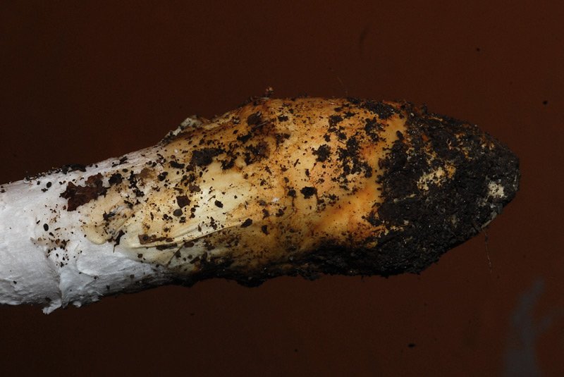 Amanita proxima Dumée 1916; Regione Umbria; Novembre 2018; Foto di Tomaso Lezzi. Simile a Amanita ovoidea, se ne distingue per la volva con colori ocracei e per l'anello più persistente. Particolare dell'anello. Particolare della volva ocracea di due differenti campioni. -
