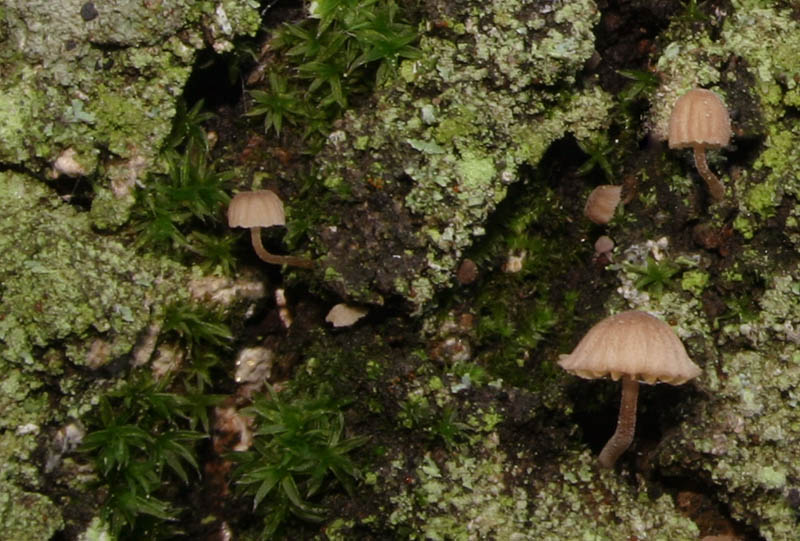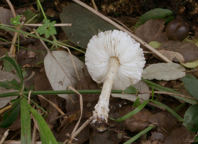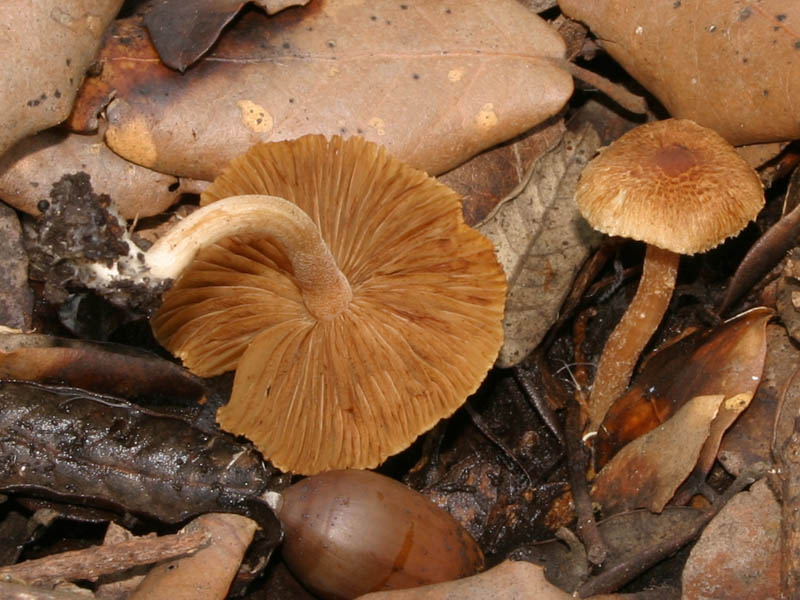 Questo è veramente piccolo, "abitava" alla base di una graminacea su terreno con legno di pini bruciati. Lamelle e lamellule bianche, il bordo del cappello era azzurro (un po' anche alla base del gambo), ma non so se era il colore suo o un colore di alterazione...