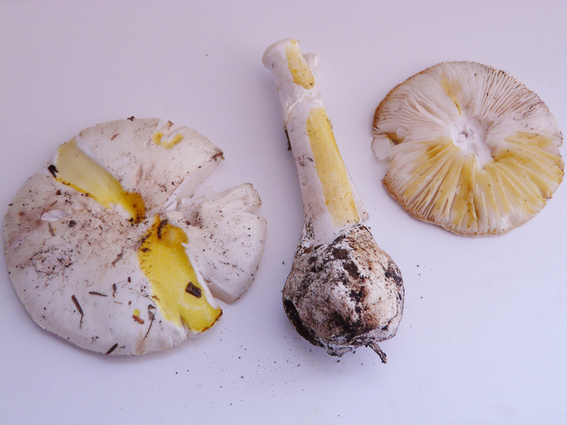 Amanita decipiens (Trimbach) Jacquet = Amanita verna var. decipiens Reazione macrochimica al KOH 30% Non solo il fungo assume colorazione gialla su tutte le parti trattate (pileo, lame, gambo) ma sembra che abbia un effetto disgregante dei tessuti pileali. -