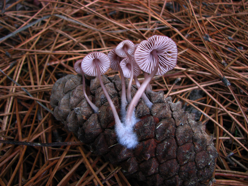 Mi sposto nella pineta Casilini, Belmonte C., alt. 700 mt. ca. è un bosco di aghifoglie (pino+abete)indotto in sostituzione di macchia mediterranea, che ha lasciato la sua impronta con qualche arbusto di erica, e qua e là roverelle e castagni. Qui è più caldo, ma funghi niente ad eccezione di questo invasivo strobiliodipendente: Mycena seynii(corretto su segnalazione di più esperti) -