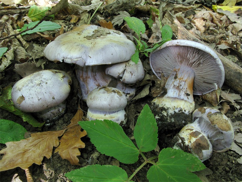 Cortinarius terpsichores Melot. Regione Emilia Romagna. Ottobre 2007. Foto e microscopia di Massimo Biraghi. Cappello con colorazioni pieiche di un bell'azzurro-blu con sfumature violette, decolorante su toni ocracei in maturità a partire dal centro. Lamelle violette nei giovani esemplari, ocracee-brunastre in stadio adulto per la maturazione delle spore. Gambo che termina con un bulbo marginato, colorazioni lilacine, può assumere toni ocracei al bulbo, velo abbondate, inizialmente biancastro o appena sfumato di violetto, poi brunastro per il deposito sporale. Carne biancastra nel cappello, appena grigia-violetta verso la metà del gambo, con sfumature ocracee nel bulbo, odore sgradevole, terroso, sapore mite. Reazioni con KOH subnulla sulla cuticola, giallastra sulla carne. Habitat sotto latifoglie con preferenza per le Querce. Commestibilità non commestibile/sospetto. Difficilmente separabile a livello macroscopico sul campo dai simili del clade /caerulescens.Si può separare dai suyoi simili per le reazioni macrochimiche e per l’ornamentazione sporale. Reazione giallastra nella carne con KOH. Reazione subnulla sulla cuticola con KOH. Spore ellissoidali con ornamentazioni evidenti, spinulose. Misurazioni su n. 24 spore. N° Long. Larg. Q Moy 8,85 5,23 1,70 Min 8,22 4,62 1,52 Max 9,56 6,18 1,84 média 8,74 5,21 1,70 Moy 8,16 4,78 1,72 Min 7,18 4,08 1,53 Max 9,50 5,99 1,93 média 7,93 4,41 1,75 Osservazione in Melzer. Spore osservazione in Rosso Congo. Basidi tetrasporici. Ife della pileipellis cilindriche, con giunti a fibbia. -