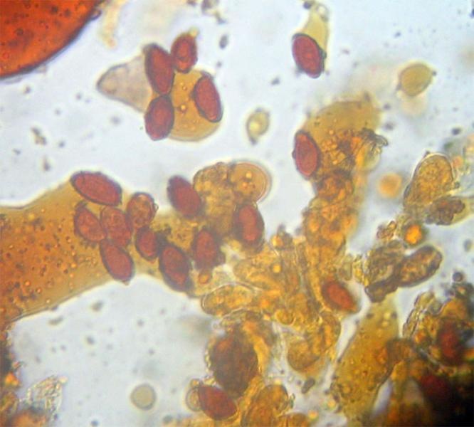 Cortinarius cotoneus Fr. Regione Lazio. Ottobre 2024. Foto di Tomaso Lezzi. 3° CSM di M.te Rufeno e M.te Amiata – 25-27 Ottobre 2024 Reazione con KOH sul cappello. Spore. Osservazione in KOH, a 1000×. -
