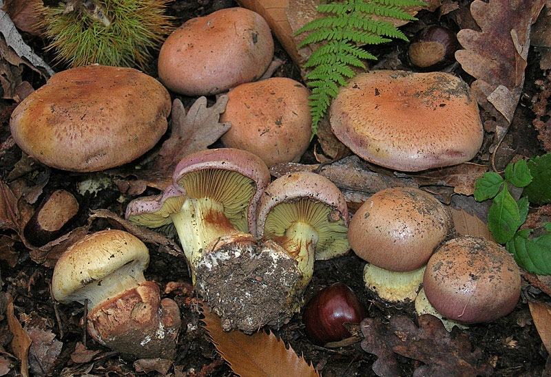 Cortinarius xanthophyllus (Cooke) Maire. Regione Piemonte, Val Sesia (VC). Foto di Federico Calledda. Phlegmacium piuttosto comune nei boschi caldi di Castagno e di Quercia. È facilmente riconoscibile per le tinte rossastre del cappello (con colorazioni violacee più o meno presenti), le lamelle gialle, il bulbo fittonante e il pigmento viola costantemente presente sotto la cuticola del cappello. In bosco misto di Castagno e Quercia. -