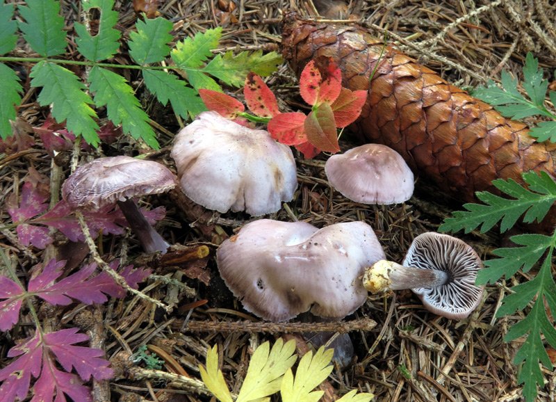 Clitocybe sinopica (Fr.: Fr.) Kummel; Regione Trentino; Giugno 2019; Foto di Pietro Curti. Lamelle giallastre e decorrenti. Cappello finemente squamuloso, rossastro, con margine involuto. -