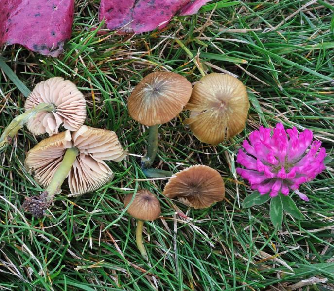Armillaria mellea (Vahl) P. Kumm. e Hypholoma fasciculare (Huds.: Fr.) Kummer, Regione Marche; Ottobre 2012; Foto di Pietro Curti. Concrescite di chiodini e falsi chiodini in siti comuni. -