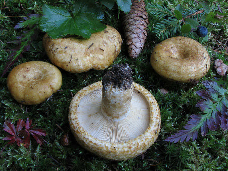 Per ultimo uno dei ritrovamenti più interessanti della giornata. Lactarius tuomikoskii Kytöv. Bella specie appartenente alla sezione degli Scrobiculati, comune in Fennoscandia ma segnalata anche nel nord Italia. Si riconosce per la peluria "agglutinata che forma come dei solchi al margine", il portamento slanciato, i cromatismi pileici giallognoli uniformi, superfice priva di zonature, le lamelle bianchastre, ondulate e anastomosate al gambo, latice scarso e bianco, presto giallo zolfo, l'assenza di scrobicoli sul gambo (se non sporadicamente alla base) e la particolarità dello stesso di macchiarsi di ocraceo alla manipolazione. Ovviamente faremo indagine micro per confermare quella che a noi sembra molto di più di un'ipotesi -