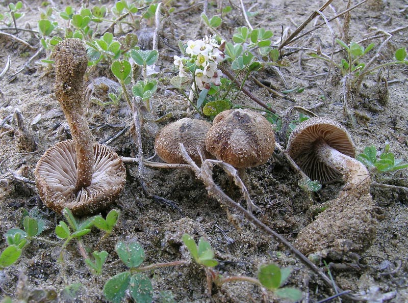 1. Inocybe rufuloides Bon 1984 Tassonomia Divisione Basidiomycota Classe Agaricomycetes Ordine Agaricales Famiglia Inocybaceae Genere Inocybe Sottogenere Inocybe Sezione Tardae Sottosezione Tardineae Foto e Descrizioni Cappello inizialmente campanulato , successivamente con umbone acuto, fibrilloso tomentoso, bruno-rossastro fino ad ocraceo. Lamelle bianco-crema leggermente arrossanti. Nei giovani esemplari è possibile apprezzare dei residui di cortina. Gambo in massima parte concolore al cappello un po' ingrossato alla base ma non bulboso. Carne con odore spermatico. Nonostante la difficoltà oggettiva del genere aiutano molto, alla determinazione, i morfocromatismi, l'habitat tipicamente xerofilo mediterraneo in ambiente dunale e in associazione (probabilmente) con il Ginepro e, nella fascia retrostante, sotto Pino. Spore lisce, largamente ellittiche 10-13 × 6-7,5 µm, caulocistidi assenti o presenti solo nella parte sommitale del gambo.