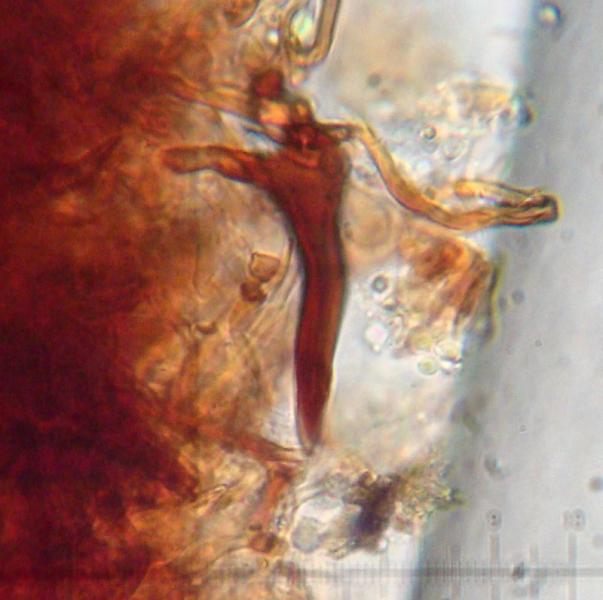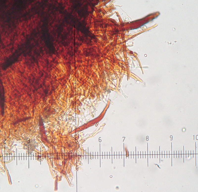 Porodaedalea pini (Brot. : Fr.) Murrill 1905 Tassonomia Divisione Basidiomycota Classe Agaricomycetes Ordine Hymenochaetales Famiglia Hymenochaetaceae Sinonimi Boletus pini Brot. : Fr. 1804 Fomes pini (Thore) P. Karst. 1882 Phellinus pini (Brot. : Fr.) Bondartsev & Singer 1941 Etimologia Dal greco póros [πόρος] = poro e dal latino Daedălēus = dedaleo, relativo a Dedalo, il leggendario architetto, ideatore del labirinto di Creta, quindi per l’imenoforo costituito da pori allungati e a labirinto che di norma contraddistingue i carpofori appartenenti a questo genere. Dal latino pīnŭs, pini = pino, per l’habitat di crescita del basidioma. Cappello 10-20 cm, dimidiato o ungulato, isolato oppure embricato, di norma non resupinato; ha la superficie sterile, che all’inizio è leggermente irsuta poi glabra ma anche feltrata in alcuni punti, zonata, solcata, rigida, rugosa o bitorzoluta, talvolta si presenta fessurata; il colore è in genere bruno-rossiccio, amaranto, a volte anche nerastro; non di rado sono presenti colorazioni verdastre per la presenza di piccole formazioni di alghe. Il margine è un poco lobato, talvolta sottile, ondulato, di colore bruno giallastro. Imenoforo Tubuli pluristratificati, di colore bruno-cannella; pori 1-3 per mm², irregolari, da rotondi ad angolosi, taluni molto allungati, fino a dedaliformi, con dissepimenti pubescenti, ispessiti, interi o leggermente sinuosi; il colore è bruno-giallastro, poi bruno-olivastro e marrone-ruggine, sfumato in alcune parti di violaceo; in alcuni punti è presente una pruina giallo vivo visibile solo con la lente. Gambo Assente, trattasi di un fungo sessile. Carne La carne ha una consistenza legnosa, dura, di colore bruno-rossiccia o marrone-cannella; odore subnullo, sapore mite o lievemente acre. A contatto con l’NaOH diviene subito nera. Habitat Cresce di norma su Pinus spp. È stato rinvenuto su Pinus pinea L., Pinus sylvestris L., Pinus halepensis Mill. e Pinus pinaster Aiton, ma anche su Larix decidua Mill. È un fungo largamente diffuso in Europa e ampiamente frequente in Italia. Microscopia Sistema ifale dimitico. GAF non osservati. Spore 5,4-6,5 × 4-5,9 µm, da subglobose ad ovoidali, spesso con profilo asimmetrico, lisce, guttulate, leggermente gialline, con parete un poco spessa ed apicolo evidente; non amiloidi, né destrinoidi. Setae 41-71 × 7-22, ventricose, subulate, diritte o con base ripiegata, a parete spessa e di colore bruno scuro. Commestibilità e Tossicità Si tratta di un fungo non commestibile. Somiglianze e Varietà Porodaedalea chrysoloma (Fr.) Fiasson & Niemelä = Phellinus chrysoloma (Fr.) Donk, si distingue per i carpofori mediamente più piccoli, per avere le spore più piccole e per vegetare principalmente su Abete rosso; Sanghuangporus pilatii (Černý) Tomšovský = Porodaedalea pilatii (Černý) Fiasson & Niemelä, si differenzia per avere le spore più piccole e per la crescita su Pioppo; Phellinus gilbertsonii M.J. Larsen = Porodaedalea gilbertsonii (M.J. Larsen), si separa per avere le spore più piccole e per vegetare su Pseudotsuga spp.; Porodaedalea laricis (Jacz. ex Pilát) Niemelä, si distingue per la crescita su Larice. Porodaedalea piceina (Peck) Niemelä = Phellinus piceinus (Peck) Pat., si differenzia per avere i pori più piccoli, per le spore ellissoidali e per vegetare principalmente su Abete rosso, Abete bianco e Larice. Osservazioni Si tratta di un fungo lignicolo, pericoloso parassita che attacca le conifere viventi in punti abbastanza alti del tronco, con una crescita longitudinale di vari basidiomi. È anche un fungo saprofita in quanto cresce anche su piante cadute a terra. In passato non tutti gli autori sono stati concordi sulla suddivisione del genere Porodaedalea tuttavia, recenti studi molecolari hanno contribuito ad alcuni chiarimenti (Tomsovsky et al. 2010). Note nomenclaturali La specie è stata identificata per la prima volta come Boletus pini da Thore nel 1803, in seguito è stata inquadrata in vari generi, come Fomes e Trametes, ma l’epiteto con cui è stata largamente conosciuta è Phellinus pini, binomio creato nel 1941 da Bondartsev e Singer. Il taxon Porodaedalea pini è stato pubblicato da Murrill nel 1905 ed è la nomenclatura attuale di questo fungo. In effetti l’imenoforo a forma di dedalo non contraddistingue di norma i pori dei carpofori appartenenti al genere Phellinus. Bibliografia BERNICCHIA, A., 2005. Polyporaceae s.l. Fungi Europæi. Vol 10. Alassio (SV): Ed. Candusso. TOMSOVSKY, M. & SEDLÁK, P. & JANKOVSKÝ, L. 2010. Species recognition and phylogenetic relationships of European Porodaedalea (Basidiomycota, Hymenochaetales). [Data di accesso: 27/12/2016]. Scheda di proprietà AMINT realizzata da Stefano Rocchi. Revisionata da Tomaso Lezzi. Regione Umbria; Novembre 2016; Bosco di Pini e Lecci del Monte Subasio (Spello - PG); Foto e microscopia di Stefano Rocchi. (Exsiccatum SR20161116-01) Ritrovamento su tronco di Pino con la mensola parallela al tronco caduto a terra. La reazione nera della carne a contatto con l’NaOH. Sistema ifale dimitico. GAF non osservati. Osservazione in KOH a 1000×. Spore 5,4-6,5 × 4-5,9 µm, da subglobose ad ovoidali, spesso con profilo asimmetrico, lisce, guttulate, leggermente gialline, con parete un poco spessa ed apicolo evidente; non amiloidi, né destrinoidi. Spore da sporata. Osservazione in acqua a 1000×. Osservazione in Melzer a 1000×. Setae 41-71 × 7-22, ventricose, subulate, diritte o con base ripiegata, di colore bruno scuro. Osservazione in KOH a 400×. Osservazione in Blu cotone in Lattofenolo a 400×. Osservazione in KOH a 1000×. Osservazione in Blu cotone in Lattofenolo a 1000×.-