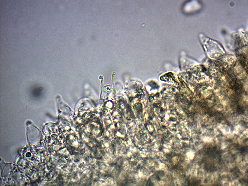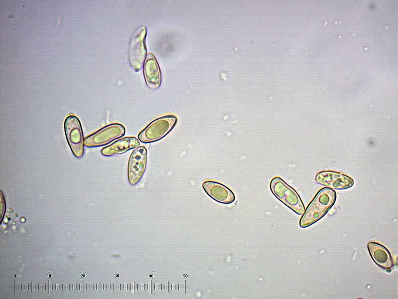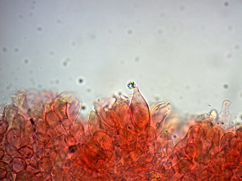 Rubroboletus dupainii (Boud.) Kuan Zhao & Zhu L. Yang 2014 Tassonomia Ordine Boletales Famiglia Boletaceae Sinonimi Boletus dupainii Boud. 1902 Tubiporus dupainii (Boud.) Maire 1937 Suillellus dupainii (Boud.) Blanco-Dios 2015 Etimologia Dupainii = nome proprio in onore del micologo francese V. Dupainii. Cappello Si determina a prima vista, anche da lontano, per il colore del cappello rosso vivo brillante, rosso ciliegia, che si stacca e contrasta nettamente con il colore smorto della lettiera delle foglie autunnali. Il cappello da giovane si presenta emisferico poi convesso, con cuticola eccedente, leggermente vischiosa a tempo umido. Imenoforo I tubuli sono gialli, poi verdastri, i pori sono piccoli, irregolari, da rosso arancio a rosso vivo, virano alla pressione al blu scuro. Gambo Cilindrico, boletoide, bulboso, clavato, di colore giallo pallido, vira debolmente al bluastro se contuso, ricoperto interamente da fini granulazioni rossastre ad eccezione della parte alta, quella in prossimità dei tubuli, ove spesso è presente un reticolo rossastro, che contrasta con il colore giallo della carne sottostante. Carne La carne è bianco-giallastra, alla sezione vira al blu in tutto il carpoforo, odore gradevole, sapore dolce. Habitat Cresce gregario a piccoli gruppi nei boschi di Quercia, Castagno, spesso condividendo lo stesso habitat dell'Amanita caesarea (Scop.: Fr.) Pers.. Ritrovato su terreno calcareo, in un bosco di latifoglie, essenza prevalente Quercia con qualche sporadico Carpino. Microscopia Spore fusiformi, lisce, con grossa guttula centrale o pluriguttulate, con parete spessa, misure effettuate su 32 spore, (10,8)11,4-13,9(14,1) × 4,5-5,4(5,6) µm; Q = 2,2-2,9; media 13,0 × 5,1 µm; Qm = 2,6. Quando si trovano campioni con diversi basidi bisporici, come nel campione osservato, le misure medie sporali sono più alte di quelle segnalate come medie in letteratura. In particolare alcuni basidi monosporici possono produrre spore molto grandi, come quella della fotografata visibile più in basso, che misura 20,4 × 6,9 µm; Q = 2,96. Basidi claviformi, osservati bisporici e tetrasporici, privi di GAF. Cistidi fusiformi, a forma di anfora, lageniforni, alcuni anche muricati, prurisettati, senza GAF. Caulocistidi, fisiformi ed a forma di anfora. Pileipellis formata da un tricoderma di ife cilindriche, settate, senza GAF, elementi terminali con apice arrotondato. Commestibilità o Tossicità Commestibile dopo adeguata cottura. Per la sua bellezza e rarità, sicuramente è una specie da proteggere. Note nomenclaturali Fungo identificato dal farmacista e micologo francese Jean Louis Émile Boudier, il quale con l'epiteto dupainii lo ha inquadrato per la prima volta nel genere Boletus. Tale binomio, salvo la parentesi di Tubiporus dupainii (Boud.) Maire, ha contraddistinto la specie fino all'avvento delle analisi filogenetiche le quali hanno dimostrato che tale fungo, insieme a varie altre specie a pori rossi, appartiene a un genere diverso da Boletus ed è stato pertanto segregato nel neogenere Rubroboletus Kuan Zhao & Zhu L. Yang. Al riguardo si evidenzia il fatto che persistono tuttora discordanze tra i vari autori su quale nome prioritario debba avere questa specie. Tutte le ricombinazioni in Suillellus di Blanco Dios riferite a taxa diversi da queletii e luridus sono prive di supporto filogenetico e quindi risulterebbero non valide. Ne consegue che attualmente la collocazione corretta di Boletus dupainii è nel genere Rubroboletus. Bibliografia GANG, W., & BANG, F., & JIANPING, X., & XUE-TAI Z., & YAN-CHUN, L., & NIAN-KAI, Z., & MD. IQBAL, H., & ZHU, L. Y., 2014. Molecular phylogenetic analyses redefine seven major clades and reveal 22 new generic clades in the fungal family Boletaceae - Fungal Diversity DOI 10.1007/s13225-014-0283-8 [data di accesso 05/05/2017] Scheda di proprietà AMINT realizzata da Mario Iannotti - Revisionata da Tomaso Lezzi. Regione Umbria; Settembre 2013; Foto, descrizione e microscopia di Mario Iannotti. (Exsiccatum MI20130920-01) Particolare del viraggio della carne al blu. Particolare del gambo, in evidenza le fini granulazioni rossastre e nella parte alta a contatto con i tubuli un reticolo rossastro che contrasta con il giallo della carne sottostante. Pori di forma irregolare, da rosso arancio a rosso vivo, virano alla pressione al blu scuro. Microscopia Spore fusiformi, lisce, con grossa guttula centrale o pluriguttulate, con parete spessa, misure effettuate su 32 spore, (10,8)11,4-13,9(14,1) × 4,5-5,4(5,6) µm; Q = 2,2-2,9; media 13,0 × 5,1 µm; Qm = 2,6. Osservazione in acqua a 1000×. Osservazione in Rosso Congo ammoniacale a 1000×. Basidi claviformi, osservati bisporici e tetrasporici, privi di GAF. Osservazione in Rosso Congo ammoniacale a 1000×. Basidi bisporici. Osservazione in acqua a 1000×. Osservazione in Rosso Congo ammoniacale a 1000×. Cheilocistidi fusiformi, a forma di anfora, lageniforni, alcuni anche muricati, prurisettati, senza GAF. Osservazione in Rosso Congo ammoniacale a 1000×. Cheilocistidi con apice muricato. Caulocistidi, fusiformi ed a forma di anfora. Osservazione In Rosso Congo ammoniacale a 400×. Osservazione in Rosso Congo ammoniacale a 1000×. Pileipellis formata da un tricoderma di ife cilindriche, settate, senza GAF, con elementi terminali con apice arrotondato. Osservazione in Rosso Congo ammoniacale a 400×. Osservazione in Rosso Congo ammoniacale a 1000×. Quando si trovano campioni con diversi basidi bisporici, come nel campione osservato, le misure medie sporali sono più alte di quelle segnalate come media in letteratura. In particolare alcuni basidi monosporici possono produrre spore molto grandi, come quella fotografata, che misura 20,4 × 6,9 µm; Q = 2,96.- 16 risposte