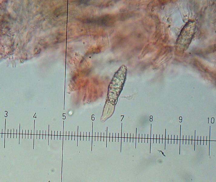 Peniophora quercina (Pers. : Fr.) Cooke 1879 Tassonomia Divisione Basidiomycota Classe Agaricomycetes Ordine Russulales Famiglia Peniophoraceae Sinonimi Thelephora quercina Pers. : Fr. 1801 Corticium quercinum (Pers. : Fr.) Gray 182 Etimologia Dal greco peníon [πηνίον] = rocchetto, bobina, tessuto, tela e phoreo [φορέω] portare, per la morfologia pellicolare dei carpofori appartenenti a questo genere. Dal latino quercūs, quercínus, a, um = Quercia, che predilige la Quercia, per l’habitat di crescita della specie. Carpoforo Resupinato, prima orbicolare, poi diffuso, esteso simile a una pellicola ben adesa al substrato, talvolta con margine biancastro; in seguito con la tendenza ad arrotolarsi ai margini mostrando la parte sterile bruno-scura o nera. La superficie fertile è all’inizio un poco gelatinosa, di colore violaceo, grigio-porpora o bluastra, liscia o tubercolata, poi coriacea, secca, di colore rosato o grigio-brunastro, spesso screpolata in minuscole fessure. Con la lente si può notare l'imenoforo cosparso da minutissime punteggiature bianche. La carne è sottilissima, alta meno di un millimetro, prima tenera poi rigida ma fragile. Habitat Cresce tutto l’anno di solito su legno di Quercus spp., tuttavia è stato rinvenuto anche su Castagno, Agrifoglio, Corbezzolo e Pioppo. Microscopia Sistema ifale monomitico. Ife munite di GAF, a parete sottile, ialine, larghe 3-4 µm nel subimenio; mentre sono bruno-marroni, di analoga larghezza, nel substrato basale. Spore 9,7-12,3 × 3,2-3,9 (5,1) µm, allantoidi, lisce, ialine, a parete sottile; non amiloidi, né destrinoidi. Basidi 35-55 × 5,5-7,5 µm, da leggermente clavati a subcilindrici, con sterigmi lunghi da 3 a 4 µm. Lamprocistidi fusiformi, assai numerosi, dapprima appuntiti, a parete sottile e senza incrostazioni, poi a parete spessa e densamente incrostati 50-70 × 10-13 µm, con la parte decorata lunga 25-50 µm. Assenti gloeocistidi e dendroifidi (elementi sterili con ramificazioni più o meno tortuose, subcilindriche e ad apice arrotondato). Commestibilità e Tossicità Non commestibile. Somiglianze e Varietà Esistono una serie di funghi corticoli appartenenti al genere Peniophora che spesso hanno tonalità rosate o violacee i quali potrebbero confondersi con Peniophiora quercina: Duportella halimi (Boidin & Lanq.) Hjortstam = Peniophora halimi Boidin & Lanq. si distingue per le spore di forma ovoidale; Peniophora proxima Bres. si differenzia per le spore ellissoidali e più larghe, per la presenza di gloeocistidi, per il margine in genere giallastro e per associarsi di norma a legno di Bosso; Peniophora pini (Schleich. : Fr.) Boidin si separa per i lamprocistidi e le spore più piccoli, per la presenza di gloeocistidi e per vegetare su Pino; Peniophora junipericola J. Erikss. si distingue per avere le spore più strette, per la presenza di gloeocistidi fusiformi e per la crescita su Ginepro; Peniophora rufomarginata (Pers.) Bourdot & Galzin si differenzia per le spore più strette, i lamprocistidi più larghi e per prediligere il legno di Tiglio anche se non è esclusiva solo di questa specie; Peniophora boidinii D.A. Reid si separa per i lamprocistidi e le spore più corti e per la presenza di gloeocistidi papillati; Peniophora tamaricicola Boidin & Malençon si distingue per l’assenza di lamprocistidi; Peniophora violaceolivida (Sommerf.) Massee si differenzia per i lamprocistidi più corti e la presenza di numerosi gloeocistidi. Osservazioni Si tratta di un fungo che colonizza legnetti a terra o marcescenti in ogni periodo dell’anno, è abbastanza comune e frequente in tutta Europa. Un elemento utile al suo riconoscimento è il margine del basidioma che in genere tende a sollevarsi ed arrotolarsi, mostrando la parte sterile nerastra. Questa caratteristica tuttavia è comune anche ad altre specie del genere Peniophora e pertanto per ottenere una corretta determinazione è necessaria sempre una adeguata verifica microscopica. Note nomenclaturali La prima descrizione della specie risale al 1801 quando Christian Hendrik Persoon nel 1801 chiamo il fungo Thelephora quercina, epiteto sanzionato da Elias Magnus Fries nel primo volume del suo Systema Mycologicum. Quindi la specie nel 1821 è stata riclassificata da Samuel Frederick Gray come Corticium quercinum, ma è nel 1879 che l'inglese Mordecai Cubitt Cooke ha trasferito la specie nel genere Peniophora, elevandola a specie tipo. Dopo numerose ricombinazioni e riclassificazioni avvenute negli anni, l’epiteto di Cooke è quello attualmente prioritario. Alcune descrizioni di specie differenti, antecedenti a quella di Persoon, come Lichen carneus nel 1787 ad opera del botanico e micologo tedesco Carl Ludwig Willdenow o come Auricularia corticale nel 1790 ad opera di Jean Baptiste François Bulliard sono state ritenute in epoca successiva sinonimi di Peniophora quercina. Bibliografia BERNICCHIA, A. & GORJON, S.P., 2010. Corticiaceae s.l. Fungi Europæi. Vol 12. Alassio (SV): Ed. Candusso. Scheda di proprietà AMINT realizzata da Stefano Rocchi. Revisionata da Tomaso Lezzi. Regione Umbria; Dicembre 2016; Su legno di latifoglia a terra (Assisi - PG); Foto e microscopia di Stefano Rocchi. (Exsiccatum SR20161223-01) Spore 9,7-12,3 × 3,2-3,9 (5,1) µm, allantoidi, lisce, ialine, a parete sottile; non amiloidi, né destrinoidi. Osservazione in L4 le due superiori e Rosso Congo le due inferiori a 1000×. Sistema ifale monomitico. Ife munite di GAF, a parete sottile, ialine larghe 3-4 µm nel subimenio; mentre sono a pareti più ispessite, bruno-marroni, di analoga larghezza, nel substrato basale. Osservazione in Rosso Congo a 1000×. Basidi 35-55 × 5,5-7,5 µm, da leggermente clavati a subcilindrici, con sterigmi lunghi da 3 a 4 µm. Osservazione in Rosso Congo a 1000×. Lamprocistidi fusiformi, assai numerosi, dapprima appuntiti, a parete sottile e senza incrostazioni, poi a parete spessa e densamente incrostati 50-70 × 10-13 µm, con la parte decorata lun