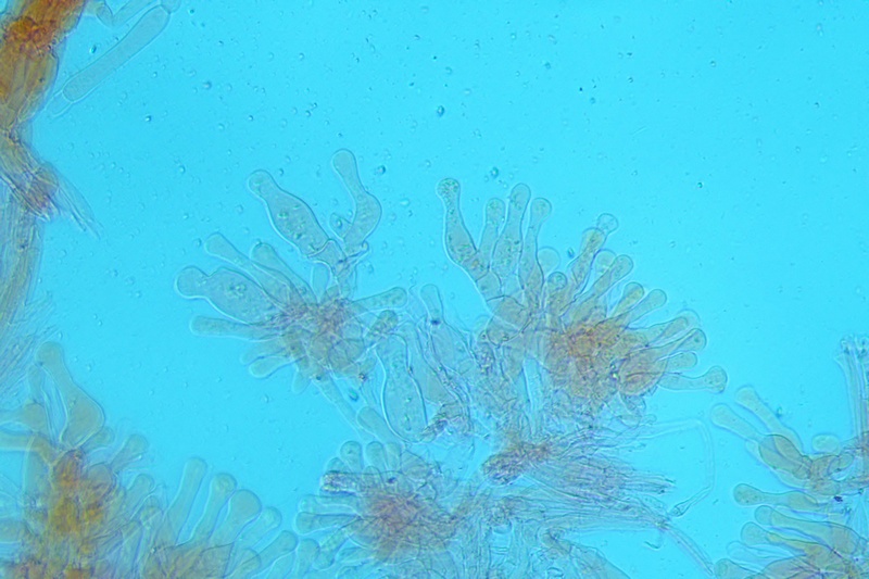 Archivio Micologico Inviato 30 Gennaio 2023 Inviato 30 Gennaio 2023 Coprinopsis pseudomarcescibilis Heykoop, G. Moreno & P. Alvarado 2017 Tassonomia Divisione Basidiomycota Classe Agaricomycetes Ordine Agaricales Famiglia Psathyrellaceae Etimologia L'epiteto Coprinopsis deriva dal genere Coprinus con il suffisso -ópsis dal greco ὄψις [ópsis] = dall'aspetto di, per l'aspetto simile a Coprinus. L'epiteto pseudomarcescibilis è una parola composta da prefisso pseudo- dal greco " ψευδο" [pseudo] = mendace, fallace, e da marcescibilis dal latino marcésco = marcescibile, che marcisce facilmente, per la somiglianza morfologica con la specie Coprinopsis marcescibilis. Cappello Umbonato, 1-4 cm inizialmente conico, poi conico-campanulato ed a maturità largamente convesso, con la parte centrale tronca, lievemente depressa e discolore in corrispondenza del disco, igrofano, bianco grigiastro quando si asciuga, il margine è moderatamente striato con elevato grado di umidità, eccedente, con evidenti fiocchi di velo lungo il del margine, che tendono a svanire completamente nei soggetti adulti. Lamelle Annesse, ventricose, regolari, alternate a lamellule di varie dimensioni, inizialmente biancastre con riflessi violacei, fino a bruno nerastre a maturazione, filo lamellare discolore, biancastro per la presenza di cheilocistidi, finemente fimbriato. Anello Filamentoso, fugace, osservabile solo nei soggetti molto giovani. Gambo Stipite 20-100 × 2-5 mm, cavo, cilindrico, striato nel primo terzo a partire dall'imenoforo, pruinoso con fibrille evidenti su tutta la lunghezza. Carne Poco consistente, odore e sapore indistinti. Habitat Fungo saprotrofo, gregario, vegeta su prato con graminacee. Microscopia Pileipellis mista, costituita da un sottile strato esterno di ife parallele, strette e allungate e da uno strato inferiore formato da cellule globose e ellissoidali, con restringimenti ai setti. Trama lamellare costituita da cellule globose. Cheilocistidi utriformi, capitulati, con peduncolo basale. Pleurocistidi non osservati. Basidi clavati, tetrasporici. Spore (11,9) 12,3-14,3 (14,4) × (6,1) 6,2-7,3 (7,6) µm; Q = (1,7) 1,8-2,1 (2,2); N = 32; Media = 13,2 × 6,8 µm; Qm = 2,0; amigdaliformi in vista laterale, ellissoidali in vista frontale, appiattite in corrispondenza del poro germinativo, lisce, di colore bruno scuro, quasi nero, con apicolo evidente. Stipitipellis costituita da cellule allungate, cilindriche. Caulocistidi di forma e dimensione variabili, cilindrici, sinuosi, capitulati, contenenti pigmento ocraceo, in parte disciolto, in parte nelle guttule. GAF presenti in tutti i tessuti. Commestibilità e tossicità Non commestibile. Specie simili Coprinopsis pseudomarcescibilis non è facile da determinare morfologicamente, potrebbe essere confusa con altre specie dei generi Coprinopsis e Psathyrella. Un esame dei caratteri microscopici contribuisce ad una corretta determinazione. Coprinopsis marcescibilis (Britzelm.) Örstadius & E. Larss è un perfetto sosia, difficilmente separabile morfologicamente, ha taglia maggiore, l'habitat non graminicolo, ma boschivo e in particolare le spore più piccole, lunghe 11-12 µm rispetto ai 13-14,5 µm delle spore di Coprinopsis pseudomarcescibilis. Coprinopsis musae Örstadius & E. Larss ha carpofori di piccola taglia, con spore 9-10,5 × 5,8-6,2 μm, molto pallide. Psathyrella candolleana (Fr. : Fr.) Maire si differenzia morfologicamente per le colorazioni più tenui, per i carpofori meno slanciata, microscopicamente per le spore piccole di 6-8 × 4-5 µm e per l'epicutis formata da un'unico strato di cellule subglobose. Bibliografia HEYKOOP M., MORENO G. & ALVARADO P., 2017. Coprinopsis pseudomarcescibilis Heykoop, G. Moreno & P. Alvarado, sp. nov. Persoonia 38, Fungal planet description sheet 594: 320-321. ÖRSTADIUS L., RYBERG M. & LARSOON E., 2015. Molecular phylogenetics and taxonomy in Psathyrellaceae (Agaricales) with focus on psathyrelloid species: introduction of three new genera and 18 new species. Mycol Progress 14, 25. Doi https://doi.org/10.1007/s11557-015-1047-x. [Data di accesso: 28/01/2023]. AA.VV., 2012. Funga Nordica. Agaricoid, boletoid and cyphelloid genera. Ed. Nordsvamp. WÄCHTER D. & MELZER A., 2020. Proposal for a subdivision of the family Psathyrellaceae based on a taxon-rich phylogenetic analysis with iterative multigene guide tree. Mycological Progress 19: 1151-1265. Doi https://doi.org/10.1007/s11557-020-01606-3. [Data di accesso: 28/01/2023]. Scheda di proprietà AMINT realizzata da Giovanni Galeotti - Approvata e Revisionata dal CLR Micologico di AMINT. Regione Umbria; Gennaio 2023; Foto e microscopia di Giovanni Galeotti. (exsiccatum GG230101-01) Ritrovamento in aiuola cittadina con presenza di varie graminacee e tigli. Residui velari sul margine del cappello, presenti nei soggetti molto giovani, residui dell'anello che tende a sparire precocemente. Pileipellis. Osservazione in rosso Congo, a 1000×. Cheilocistidi. Osservazione in rosso Congo, a 400×. Cheilocistidi. Osservazione in rosso Congo, a 1000×. Basidi tetrasporici. Osservazione in rosso Congo, a 400×. Ife del velo. Osservazione in rosso Congo, a 400×. Ife del velo. Osservazione in rosso Congo, a 1000×. Spore (11,9) 12,3-14,3 (14,4) × (6,1) 6,2-7,3 (7,6) µm; Q = (1,7) 1,8-2,1 (2,2); N = 32; Media = 13,2 × 6,8 µm; Qm = 2,0; Osservazione in acqua, a 1000×. Spore bruno nerastre, amigdaliformi in vista laterale, ellissoidali in vista frontale. Osservazione in acqua a 1000×. Spore. Osservazione in rosso Congo, 1000×. Stipitipellis. Osservazione in rosso Congo, a 1000×. Caulocistidi. Osservazione in rosso Congo, a 400×. Caulocistidi. Osservazione in rosso Congo, a 1000×.