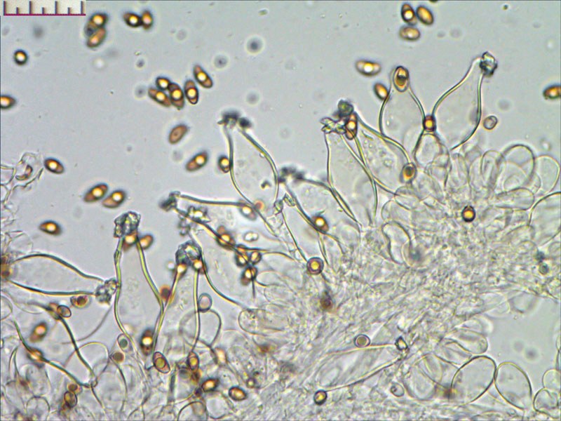 Archivio Micologico Inviato 9 Aprile 2016 Inviato 9 Aprile 2016 Inocybe geophylla (Fr. : Fr.) P. Kumm. 1871 Tassonomia Divisione Basidiomycota Classe Agaricomycetes Ordine Agaricales Famiglia Inocybaceae Genere Inocybe Sottogenere Inocybe Sezione Tardae Sottosezione Geophyllinae Note tassonomiche Il sottogenere Inocybe, che annovera specie che hanno spore lisce e cistidi metuloidi, secondo la sistematica utilizzata (M.Bon) è suddiviso in cinque sezioni: Inocybe, Laticiferae, Lilacinae,Tardae e Splendentes. Inocybe geophylla è inserita nel sottogenere Tardae, che annovera entità variamente colorate con presenza di cortina osservabile nei giovani primordi e per avere caulocistidi apicali, raramente presenti nel terzo superiore, e nella sottosezione Geophyllinae per il rivestimento pileico compatto, le colorazioni biancastre o violette, e la cortina visibile al margine del cappello, i caulocistidi sono rinvenibili esclusivamente nella parte sommitale. Etimologia Dal greco geos (χθών) = terra e phyllon (φύλλον) = lamella. Cappello Di piccole-medie dimensioni (2-4 cm), inizialmente acuto-conico, poi conico-convesso, infine disteso, sempre con presenza di un umbone acuto e molto pronunciato, il margine è inizialmente aderente al gambo e appendicolato per il velo cortiniforme, poi disteso a maturazione. Cuticola liscia e di aspetto sericeo, glabra, colorazioni pileiche bianco puro, bianco sporco, spesso con leggere sfumature grigiastre o ocra-giallastre in vetustà, in particolare localizzate nella zona discale. Lamelle Moderatamente fitte, e intercalate da lamellule di varia lunghezza, adnate o sublibere al gambo, inizialmente di colore bianco sporco, infine ocra-grigiastre, ocra chiaro, con filo più chiaro e leggermente eroso. Gambo Da 4 a 6 cm, cilindrico, più o meno slanciato, con base un poco ingrossata, mai bulbosa, pruinoso nella parte superiore, di colore bianco o bianco-avorio. Carne Poco consistente, biancastra, un poco fibrosa nel gambo, con odore spermatico. Microscopia Spore (8) 8,5-9,5 (10,3) × (4,5) 5-6 (6,5) µm, subamigdaliformi-subfaseoliformi, lisce. Basidi 25-35 µm di lunghezza, banali, clavati, tetrasporici. Cheilocistidi 40-65 × 12-22 × 6-10 (collo) µm, abbondanti, da fusiformi a subfusiformi, anche ventricosi, muricati, pareti spesse fino a 2 µm, giallastre con ammoniaca. Pleurocistidi 40-70 × 10-25 µm, non abbondanti, analoghi ai cheilocistidi. Caulocistidi 40-65 × 12-20 µm, presenti solo all’apice del gambo, simili ai cistidi imeniali. Paracistidi e paracaulocistidi clavati. GAF presenti. Habitat Specie gregaria, ubiquitaria, distribuita dalla macchia mediterranea sino ai boschi montani di conifere boreali, cresce dall'estate ai primi freddi dell'inverno in gruppi, a volte anche numerosi. Specie comune e molto diffusa, si presenta spesso insieme a Inocybe geophylla var. lilacina (Peck) Gillet. Commestibilità e tossicità Tossico, sospettato di provocare la Sindrome Muscarinica come tutte le Inocybe. Specie simili Generalmente la sua determinazione sul campo non è particolarmente problematica, qualche possibile confusione potrebbe insorgere con alcune Inocybe dalle colorazioni biancastre; Inocybe pudica Kühner = Inocybe whitei (Berk. & Broome) Sacc. si distingue per il cappello privo di un umbone acuto, le lamelle fitte, ocra-brunastre con toni rossastri a maturazione, ma sopratutto per il caratteristico arrossamento di tutto il basidioma. Microscopicamente presenta moltissime affinità con Inocybe geophylla per via dei cistidi imeniali fusiformi o subfusiformi, spesso anche panciuti e con cristalli di Ossalato di Calcio (muricati) all’apice, e per le spore lisce, largamente elissoidi o subamigdaliformi solo leggermente più strette. Inocybe umbratica Quél. è di dimensioni più importanti, presenta un cappello convesso con ampio umbone ottuso poco appariscente, ha lamelle biancastre in gioventù, grigio-ocra chiaro con sfumature rosate a maturazione, il gambo è bianco ghiaccio o bianco-grigiastro e terminante con un bulbo più o meno marginato. Microscopicamente ha spore gibbose e i caulocistidi presenti su tutta la lunghezza del gambo. Osservazioni Specie molto comune e presente dalla pianura alla montagna, si riconosce sul campo per le dimensioni medio-piccole, il cappello a lungo conico-convesso con presenza di un umbone acuto, l'aspetto sericeo, la presenza di un velo cortiniforme nei primordi, e per le lamelle color grigio-argilla. Nelle stesse aree di crescita, spesso nella stessa stazione, fruttifica Inocybe geophylla var. lilacina (Peck) Gillet; questa entità si diversifica per le colorazioni pileiche viola, lilla-violetto, grigio-lilla, lilla-pallido, decoloranti con l'età, ma si conoscono raccolte anche senza traccia di toni violacei, e presenta un umbone di colore giallo-ocraceo più o meno scuro. Le lamelle sono lilla chiaro, presto ocraceo-brunastre, il gambo con toni lilla più o meno intensi, sempre più pallido a maturità, la carne è biancastra, lilacina nella zona sottocuticolare e in quella corticale del gambo. L’osservazione dei caratteri microscopici non evidenzia nessuna differenza con la specie tipo. Bibliografia ALESSIO, C.L. & REBAUDENGO E., 1980. Inocybe, in G. Bresadola. Iconographia Mycologica. Vol. 29. Trento. BON, M., 1997. Clé monographique du genre Inocybe (Fr.) Fr. 2ème Partie: sous-genre Inocybe = Inocybium (Earle) Singer. Documents Mycologiques 27, 108: 1-77. FERRARI, E., 2006. Inocybe alpine e subalpine. Il genere Inocybe (Fr.) Fr. nel Nord Italia e paesi limitrofi. Fungi Non Delineati, Pars XXI: 1–457. Alassio: Ed. Candusso. KUYPER, T.W., 1986. A Revision of the Genus Inocybe in Europe. 1. Subgenus Inosperma and the Smooth-spored Species of Subgenus Inocybe.Persoonia. Suppl. Vol. 3. Rijksherbarium. Dfl. 109., Leiden. STANGL, J., 2000. Guida alla determinazione dei funghi. Inocybe. Vol. 3. Ed. Saturnia. Scheda di proprietà AMINT realizzata da Massimo Biraghi - Approvata e Revisionata dal CL