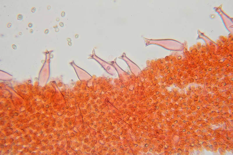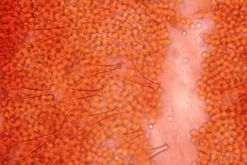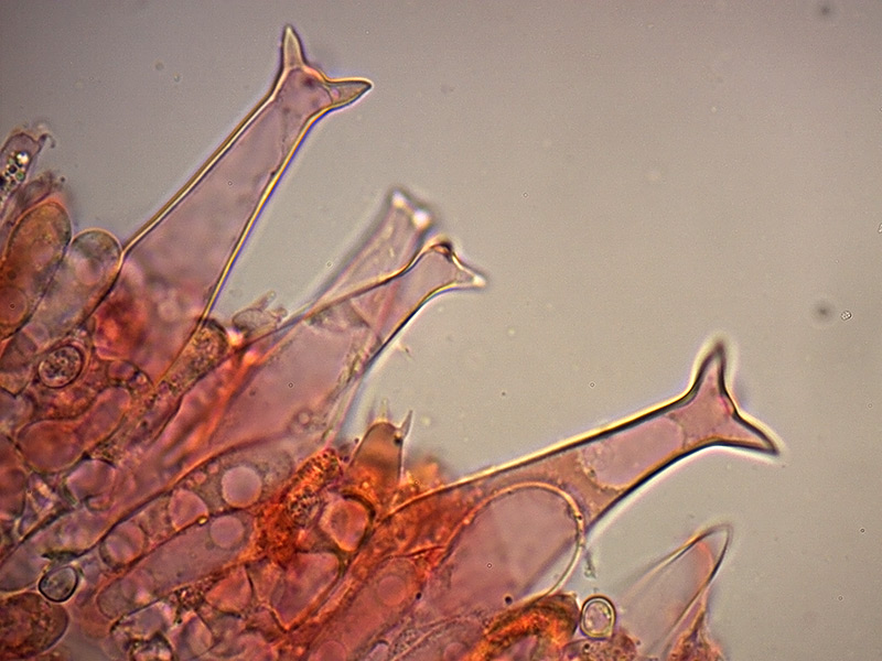 I pleurocistidi hanno una diversa tipologia a seconda del punto in cui sono osservati: quelli vicino al filo della lamella spesso terminano con una sola punta o con un accenno di uncini mentre quelli più lontani, verso il centro della lamella sono strettamente fusiformi, a parete spessa, con 2-6 uncini all'apice. Osservazione in rosso Congo ammoniacale a 400×.