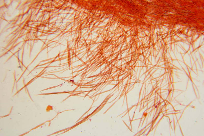 Pileipellis è costitutita da una cutis di ife cilindriche con andamento sub-parallelo, con terminali rialzati. Osservazione in rosso Congo ammoniacale a 100×.