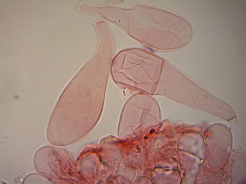 Cheilocistidi con profilo largamente clavato e parete sottile. 400×. Osservazione in Rosso Congo ammoniacale.