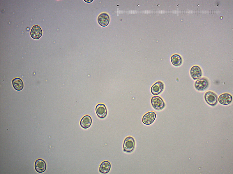 Spore: 6,4-8,5 × 4,7-6,0 µm, Q = 1,2-1,5; Qm = 1,3; da largamente ellissoidali ad ellissoidali, alcune munite di guttula centrale, lisce, con apicolo poco evidente. Osservazione in rosso Congo ammoniacale a 1000×.