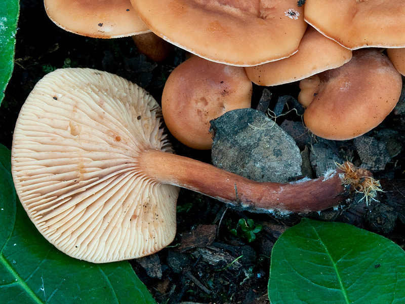 Archivio Micologico Inviato 15 Settembre 2019 Autore Inviato 15 Settembre 2019 Lactarius atlanticus Bon; Regione Umbria; Novembre 2016; Foto e commento di Mario Iannotti. Ritrovamento sotto Quercus ilex, ambiente lacustre, con terreno sabbioso, cappello liscio, con colorazioni fulvo-arancio, più cariche al centro, sfumano su toni pallidi verso il margine, gambo cilindrico, concolore, dalla metà verso la base con colori più carichi e con presenza di una peluria ocra-aranciata, crescita fascicolata e gregaria. Lamelle abbastanza fitte, subdecorrenti, ocracee. Latice scarso, trasparente, sieroso. L’odore è distintamente cimicino. Le specie macroscopicamente più vicine sono: il Lactarius serifluus, che condivide lo stesso ambiente ed ha lo stesso odore, si differenzia per la cuticola granulosa, privo di tonalità fulvo-rossastre, si caratterizza piuttosto per i toni bruno-ocracei, tende ad avere il cappello di dimensione maggiore rispetto al gambo; Lactarius subumbonatus ha il cappello fortemente grinzoso-rugoso, bruno scuro; Lactarius cremor ha gli stessi toni fulvo-aranciati, differisce però per le piccole dimensioni, la cuticola granulosa con il margine del cappello spesso crenulato, l’odore particolare di foglia d’edera e predilige l’associazione con il Faggio; Lactarius camphoratus, predilige l’habitat di montano di conifera, si caratterizza per il colore del cappello e del gambo di un bel bruno-rossastro con sfumature violacee, con l’invecchiamento la tinte violacee aumentano nello stipite, odore di cimice. La presente determinazione si fonda esclusivamente sui caratteri macroscopici della specie e sul confronto dei caratteri morfologici delle specie simili. Dalla metà alla base del gambo i colori sono più carichi e con presenza di una peluria ocra-aranciata.
