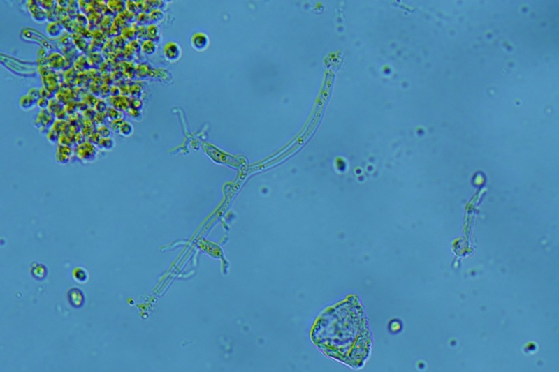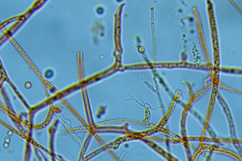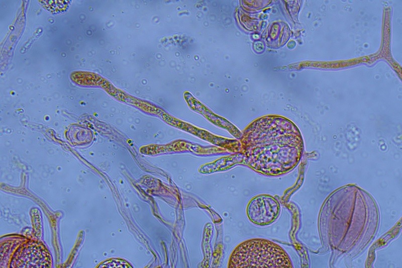 Archivio Micologico Inviato 3 Maggio 2016 Inviato 3 Maggio 2016 Tremella mesenterica Retz. : Fr. 1769 Tassonomia Divisione Basidiomycota Classe Tremellomycetes Ordine Tremellales Famiglia Tremellaceae Sinonimi Helvella mesenterica Schaeff. 1774 Tremella albida Huds. 1778 Tremella lutescens Pers. 1798 Tremella candida Pers. 1801 Etimologia L'epiteto Tremella deriva dal latino trĕmŭlus = tremolante, per la consistenza gelatinosa del carpoforo. L'epiteto mesenterica deriva dal greco μεσεντέριον [mesentérion] = mesenterio, da μέσος [mésos] mezzo e da ἔντερον [enteros] = intestino, per la forma che ricorda un intestino. Basidioma 1-5 cm, gelatinoso, giallo brillante, giallo aranciato, o a volte giallo più pallido, fino quasi a bianco, a forma di cuscino, o ripiegato più volte su sé stesso, cerebriforme. Carne Gelatinosa, gialla, fino a quasi trasparente. Habitat Su rami e legni morti a terra soprattutto di latifoglia, ma anche di conifera. In realtà questa specie non è saprotrofa, ma parassita di Peniophora incarnata, un fungo corticioide che cresce sul legno. Anche le altre specie di Tremella sono tutte parassite di funghi corticioidi, polipori, pirenomiceti o licheni. Comune anche d'inverno. Microscopia Basidi (16,2) 18,2-23,0 (23,1) × (13,7) 15,7-21,2 (21,6) µm; Q = (1,0) 1,04-1,2 (1,3); N = 12; Media = 20,3 × 18,2 µm; Qm = 1,1; da ellissoidali a subglobosi, con 2-4 setti, che separano 2-4 cellule che portano gli sterigmi. Tetrasporici in grande maggioranza, occasionalmente bisporici, con abbondanti goccioline oleose. Sterigmi (15,6) 16,2-65,5 (65,9) × (2,3) 2,9-4,37 (4,4) µm; Q = (3,6) 3,8-17,0 (21,0); N = 20; Media = 35,4 × 3,6 µm; Qm = 10,4; molto lunghi, strettamente clindrici, sinuosi. Spore (11,0) 11,9-14,0 (14,6) × (7,6) 7,62-9,7 (10,4) µm; Q = (1,3) 1,32-1,6; N = 13; Media = 12,9 × 8,9 µm; Qm = 1,5; ellissoidali, con apicolo evidente, con piccole gocce oleose. Occasionalmente producono spore secondarie. Conidiofori ramificati abbondantemente e irregolarmente. Conidiospore (2,8) 3,2-4,1 (4,6) × (1,9) 2,5-3,5 (4,0) µm; Q = (1,0) 1,1-1,4 (1,7); N = 40; Media = 3,6 × 3,0 µm; Qm = 1,2; subglobose, di profilo e dimensioni irregolari, molto più piccole delle basidiospore. Negli esemplari giovani le conidiospore possono essere molto abbondanti, con basidiospore occasionali. GAF presenti in tutti i tessuti. Hsustoria (cellule austoriali) presenti soprattutto vicino al substrato, negli esemplari maturi, ma non in quelli giovani. Sono formate da cellule madri più grandi, da cui si dipartono i filamenti austoriali, delle cellule cilindriche più sottili. Cellule rigonfie da sferiche a fusiformi, a parete spessa, ialine, simili ai basidioli in formazione. Hyphidia formati da cellule terminali, largamente clavate. Commestibilità e tossicità Considerato non commestibile in occidente, ma alcune altre specie di Tremella sono state a lungo usate come cibo o medicina tradizionale in Cina e in altri paesi asiatici. Specie simili Tremella aurantia è sicuramente la specie più simile. Si differenzia per l'habitat, poiché parassita Stereum hirsutum, spesso visibile sullo stesso ramo; ha aspetto opaco e non lucido o grasso e ha dimensioni spesso maggiori. Microscopicamente ha spore subglobose, più piccole, ife senza GAF e presenta ife della specie ospite. Exidia spp. anche a questo genere appartengono specie di aspetto gelatinoso, nessuna di colore giallo e hanno tutte spore con profilo a salsicciotto, invece che globose o ellissoidali come nel genere Tremella. Recentemente (Zhao et al. 2019) sono state descritte 4 nuove specie di Tremella: Tremella basidiomaticola, T. cheejenii, T. erythrina e T. salmonea, ma nessuna di queste ha colori simili a Tremella mesenterica. Altre Tremella gialle, come T. philippinensis, T. brasiliensis, T. subrubiginosa, T. taiwanensis, T. mesenterella, T. iduensis, T. boninensis, T. flava, T. samoensis non sono ancora mai state trovate in Europa, e si distinguono per uno o più dei seguenti caratteri: i basidiomi foliosi o pulvinati, i basidi < 25 µm di lunghezza, le spore globose o subglobose e l'assenza di vescicole. Note nomenclaturali Tremella lutescens Pers. è considerata nomen dubium, e deve essere considerata come sinonimo di Tremella mesenterica. Tremella albida Huds. e Tremella candida Pers. sono anch'esse considerate entrambe nomina dubia e rappresentano forme con basidiomi chiari o albini di Tremella mesenterica. Bibliografia OVERALL, A., 2017. Tremella aurantia & T. mesenterica, two British 'Yellow Brain Fungi' compared. Field Mycology 18(3): 82-84. DOI: 10.1016/j.fldmyc.2017.07.005. PIPPOLA, E. & KOTIRANTA, H., 2008. The genus Tremella (Basidiomycota, Tremellales) in Finland. Ann. Bot. Fennici 45: 401–434. ROBERTS, P., 1995. British Tremella species I: Tremella aurantia & T. mesenterica. Mycologist 9(3): 110-114. ZHAO, Y., LIU, X.-z., BAI, F.-y., 2019. Four new species of Tremella (Tremellales, Basidiomycota) based on morphology and DNA sequence data. MycoKeys 47: 75-95. DOI: 10.3897/mycokeys.47.29180. Scheda di proprietà AMINT realizzata da Giovanni Galeotti e Tomaso lezzi - Approvata e Revisionata dal CLR Micologico di AMINT. Regione Umbria; Marzo 2022; Foto e microscopia di Giovanni Galeotti. (Exsiccatum GG220203-01) Basidiomi di consistenza gelatinosa, ripiegati su se stessi, che richiamano il padiglione auriculare. Basidi e basidioli. Osservazione in rosso Congo, a 400×. Basidioli, conidiofori ramificati e conidi. Osservazione in rosso Congo, a 1000×. Basidi con lunghi sterigmi, sinuosi, polipoidi. Osservazione in rosso Congo, a 1000×. Ife settate con GAF, contenenti pigmento giallo, in guttule cilindriche o globose. Osservazione in rosso Congo, a 1000×. ( Spore (11,0) 11,9-14,0 (14,6) × (7,6) 7,62-9,7 (10,4) µm; Q = (1,3) 1,32-1,6; N = 13; Media = 12,9 × 8,9 µm; Qm = 1,5; ellissoidali, contenenti piccole gocce oleose, apicolo evidente. Osservazione in rosso Congo, a 1000×. Conidiospore (2,