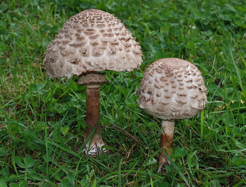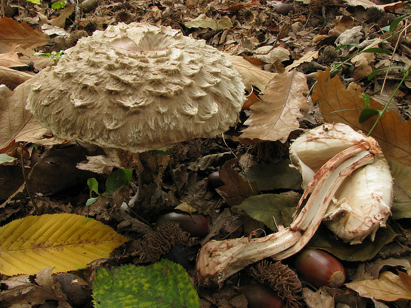 Archivio Micologico Inviato 9 Marzo 2016 Inviato 9 Marzo 2016 Chlorophyllum rhacodes (Vittad.) Vellinga 2002 Tassonomia Regno Fungi Divisione Basidiomycota Classe Agaricomycetes Ordine Agaricales Famiglia Agaricaceae Sinonimi Macrolepiota rhacodes (Vittad.) Singer 1951 Etimologia Dal latino chlorophyllum = con le lamelle verdognole. Cappello Cappello 6-15 cm, globoso, a lungo emisferico o convesso, infine disteso ed espanso; sprovvisto di umbone, presenta una zona liscia o leggermente areolata in corrispondenza del disco, di colore bruno su fondo chiaro, mentre altrove è rivestito da grosse scaglie biancastre, spaziate, con l'estremità brunicce e rivolte verso l'alto; orlo leggermente frangiato. Lamelle libere al gambo, bianche oppure crema, arrossanti alla manipolazione o con l'età. Gambo Gambo 12-20 × 1-1,5 cm, cavo, più o meno slanciato e ricurvo, cilindrico o leggermente svasato verso il basso dove termina con un vistoso bulbo; inizialmente biancastro, imbrunisce con l'età e si macchia di rosso-bruno alla manipolazione; si stacca facilmente in quanto la sua carne presenta struttura eterogenea rispetto a quella del cappello. Anello scorrevole, spesso, biancastro sulla faccia superiore, è sovente macchiato di bruno su quella inferiore. Carne Carne Bianca, che subito si tinge di arancio carota o rosso al taglio; dopo qualche minuto di esposizione all'aria vira al rosso-bruno. Odore di patata cruda e sapore di nocciola. Habitat In esemplari isolati o a gruppi, talvolta anche abbastanza numerosi, soprattutto in parchi e giardini, ma anche nei boschi, specialmente ma non solo quelli di conifere; dalla fine dell'estate all'autunno, abbastanza comune. Commestibilità e tossicità Si tratta di specie tossica, la sua ingestione provoca sindrome gastroenterica incostante più o meno accentuata. Specie simili Chlorophyllum brunneum (Farl. & Burt) Vellinga, noto in passato come Macrolepiota rhacodes var. hortensis Pilát ex Wasser o Macrolepiota bohemica (Wichanský) Krieglst., presenterebbe cappello ricoperto da squame disposte secondo una geometria più regolare ed in modo tale da formare una sorta di piccoli ciuffi, il bulbo basale assumerebbe una forma più smarginata molto simile a quello di alcuni Cortinarus e sarebbe tipica delle regioni del Sud; Macrolepiota venenata Bon, attualmente messa in sinonimia con Chlorophyllum rhacodes, avrebbe una superficie pileica che, invece di dissociarsi in squame, si romperebbe in modo irregolare; con molta probabilità, comunque, si tratta solo di varianti ecologiche della specie trattata. Macrolepiota procera (Scop. : Fr.) Singer, la più conosciuta e consumata tra le cosiddette "Mazze di tamburo", si riconosce abbastanza agevolmente per le dimensioni mediamente maggiori, le squame sul cappello molto più rade, il gambo caratteristicamente tigrato, la carne che, alla sezione, non arrossa. Macrolepiota konradii (Huijsman ex P.D. Orton) M.M. Moser presenta il cappello umbonato e la cuticola caratteristicamente lacerata in maniera tale da formare una sorta di decorazione "a stella". Curiosità Originariamente il Genere Chlorophyllum raccoglieva esclusivamente specie con sporata in massa verdognola, e l'attuale Chlorophyllum rhacodes veniva inserito nell'ambito del Genere Macrolepiota; successivamente studi di natura molecolare hanno dimostrato che la sua posizione tassonomica corretta è quella attuale. Note nomenclaturali La prima descrizione della specie risale al 1835 quando Carlo Vittandini chiamò il fungo Agaricus rachodes, poi nel 1951 Singer gli diede l'epiteto di Macrolepiota rhacodes, quindi il fungo nel 2002 è stato riclassificato da Vellinga in Chlorophyllum rhacodes, binomio attualmente prioritario. Dibattuta negli anni è stata la precisa denominazione della specie: se aderente alla diagnosi originale (rachodes), oppure all'epiteto mutato negli anni di rhacodes. La questione è stata definita nell'anno 2017 dai nomenclaturisti i quali hanno stabilito che il nome rhacodes è ortograficamente più corretto di rachodes. Foto e Descrizioni Regione Toscana; Novembre 2008; Foto di Alessandro Francolini. Scheda AMINT tratta da "Tutto Funghi". Particolare del cappello, con le scaglie in primo piano: scaglie rivolte verso l'alto e con l'estremità bruna.