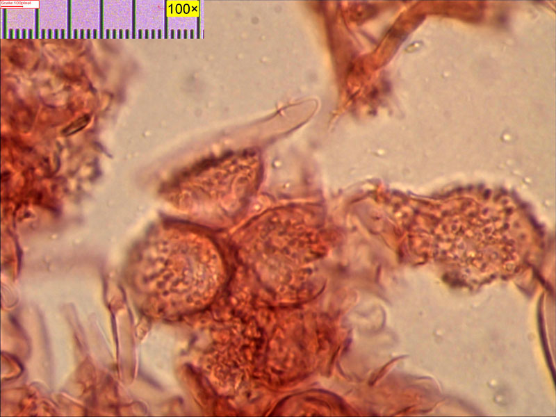 Archivio Micologico Inviato 19 Aprile 2016 Autore Inviato 19 Aprile 2016 Marasmius bulliardii Quélet; Regione Lombardia; Maggio 2013; Foto, commento e microscopia di Massimo Biraghi. Molto si è detto, sulla diversità (cito i taxa presenti su molte opere nella letteratura, non ultima quella da noi addottata) di Marasmius rotula, Marasmius bulliardii, Marasmius quercophilus e non ultimo Marasmius wettstenii. Se meno diffilcoltosa sembrerebbe la distinzione tra Marasmius rotula e Marasmius bulliardii, diventa più difficile interpretare e verificare le differenze tra M. bulliardii, Marasmius quercophilus e M. wettstenni. Ci vengono in aiuto, ma è tutt’altro che facile, viste la consistenza e le dimensioni dei miceti, le osservazioni dei caratteri microscopici, in primis la forma degli elementi della pileipellis. Marasmius rotula, bulliardii e wettsenii sono collocati nella Famiglia delle Marasmiaceae, Genere Marasmius, Sezione Marasmius, Subsezione Marasmius per la pileipellis con cellule diverticolate (tipo scopa) e di tipo ruota denticolata (rotary cells). Se l’identificazione di Marasmius rotula può essere agevolata anche per la crescita su un substrato specifico (legno), oltre che per le celle con proiezione molto varabile della pileipellis, diverso è il caso della distinzione tra M. bulliardii e M. wettsteini, anche in relazione al fatto che molti autori li sinonimizzano, considerando M. wettstenii una mera varietà di conifera di M. bulliardii. Bisogna constatare che macroscopicamente le colorazioni della cuticola appaiono ocracee o ocra-brunastre in M. wettstenii, ma questo potrebbe essere dovuto alla crescita su detriti (per lo più aghi) di conifera (Picea e Abies) e quindi in substrato acido. Microscopicamente i due taxa sono simili, vengono prese in considerazione le misure delle protuberanze delle celle, nel caso specifico più corte e fini in M. wettstenii, ma ci si può rendere conto quanto sia pretestuosa questa distinzione. Macroscopicamente vengono ritenuti “importanti” il numero delle lamelle, fino a 19 in M. bulliardii, fino 15-16 in Marasmius wettstenii. Diverso invece il discorso per Marasmius quercophilus (Gymnopus), inserito nella Famiglia delle Omphalotaceae (cheilocistidi e pileipellis mai con celle tipo rotary o di tipo dryophila) Genere Gymnopus sezione Androsacei , con pileipellis imeniforme e irregolarmente a trichodema, diverticolata con 2-3 elementi e con struttura ramificata) Macroscopicamente presenta lamelle più rade (max 12 elementi) inserite in un pseudocollarium. Un'attenta osservazione di questi caratteri ci permette una “agevole” separazione. Gera d'Adda; località Pumenengo, su fogliame e piccoli detriti vegetali nei pressi di Farnia. Microscopia Spore da ellissoidali a larmiformi (sporata). Basidi banali, tetrasporici. Filo lamellare con basidioli e cistidioli. Cheilocistidi tipo "rotary". Pileipellis con ife intricate, non tipo dryophila e cellule del tipo rotary.