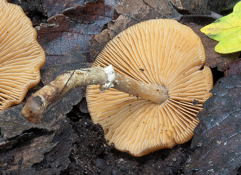 Imenoforo a lamelle ventricose, adnate e leggermente decorrenti per un dentino all'inserzione con lo stipite, di colore inizialmente biancastro, poi a maturità bruno ocraceo, con tagliente finemente eroso, discolore rispetto alle facce delle lamelle, per la presenza di cheilocistidi.