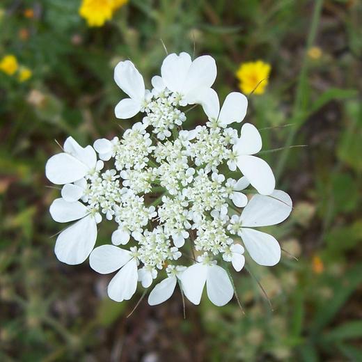 Ospite Inviato 21 Dicembre 2006 Inviato 21 Dicembre 2006 Tordylium officinale L. (1753) Sinonimi Condylocarpus officinalis (L.) W.D.J.Koch (1824) Tassonomia Divisione: Magnoliophyta Classe: Magnoliopsida Ordine: Apiales Famiglia: Apiaceae Nome italiano Ombrellini minori Etimologia Tordylium: dal greco τορδύλιον (tordylion), a sua volta derivato dal greco τόρνος (tórnos) = scalpello, tornio; e da ἴλλω (íllo) = girare attorno. In riferimento alla forma tondeggiante dei frutti. Officinale: dal latino medioevale officina = laboratorio, qui inteso nel senso di "laboratorio farmaceutico"; in riferimento alle sue proprietà medicinali. Descrizione Pianta erbacea annuale, simile a Tordylium apulum ma più rara e a distribuzione più localizzata. Sembra essere presente in buona parte dell'Italia meridionale escludendo forse la Calabria da cui non si hanno segnalazioni ben documentate. Alloctona o avventizia in Liguria, Trentino e Friuli Venezia Giulia. Tordylium officinale ha fusto eretto, alto fino a 50 cm, ramoso, pubescente per la presenza di peli morbidi e più o meno patenti. Ha foglie superiori imparipennate, dal contorno crenato. L'infiorescenza è costituita da ombrelle a 8-14 raggi. Il frutto è un diachenio lungo 2-3 mm, dal bordo corrugato. Fiorisce tra maggio e giugno in pascoli o prati aridi e incolti. Rispetto a Tordylium apulum la distinguono le foglie inferiori dal profilo triangolare (in T. apulum le foglie inferiori hanno profilo ovato-lineare) e i fiori periferici dell'infiorescenza che presentano 2 petali "vessillari", cioè molto più estesi e lunghi degli altri, ciascuno dei quali è profondamente bilobo e con lobi assai diseguali (in T. apulum solo un petalo, bilobo, è maggiore degli altri). Periodo di fioritura, presenza, distribuzione in altezza