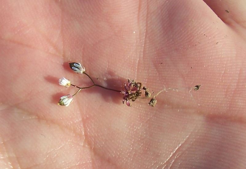 Ospite Inviato 7 Febbraio 2007 Inviato 7 Febbraio 2007 Erophila verna (L.) Chevall. Sinonimi: Draba sauteri Auct.fl.ital. non Hoppe Draba verna L. Nome italiano: Draba primaverile Sottospecie: Erophila verna (L.) Chevall. subsp. verna (It. Sett.) Erophila verna (L.) Chevall. subsp. obconica (De Bary) Vollm. (nel Canton Ticino) Erophila verna (L.) Chevall. subsp. praecox (Steven) P. Fourn. (qui riprodotta; è la più diffusa) Erophila verna (L.) Chevall. spatolata (Láng) Walters (in Sicilia) SISTEMATICA Regno: Plantae Sottoregno: Tracheobionta - Piante vascolari Superdivisione: Spermatophyta - Piante con semi Divisione: Magnoliophyta (Angiospermae) - Piante con fiori Classe: Magnoliopsida Brongn., Enum. Pl. Mus. Paris: xxvi, 95. 12 Aug 1843 (Magnolineae). Ordine: Capparales Hutch., Bull. Misc. Inform. 1924: 122. 29 Mai 1924 (Capparidales). Famiglia: Brassicaceae Burnett, Outl. Bot.: 854, 1093, 1123. Jun 1835, nom. cons. Genere: Erophila Specie: Erophila verna (L.) Chevall. DESCRIZIONE: Tipo: Esile pianta erbacea annuale Altezza (min./max) 2-10 cm. Fusto: afillo Foglie: tutte in rosetta basale, lanceolate-spatolate Fiori: in infiorescenza racemosa Corolla: formata da 4 petali bianchi, bilobi Calice: formato da 4 sepali acuti, carenati, col dorso arrossato Frutto: siliquetta glabra ALTRE INFORMAZIONI: Forma biologica: T scap - Terofite scapose (Terofite = Piante erbacee annuali che sopravvivono nella stagione avversa grazie ai semi.) Periodo di fioritura: I-V Altitudine: 0/2400 m. Regioni in cui è presente: FRI VEN TAA LOM PIE LIG EMI TOS MAR UMB LAZ CAM ABR MOL PUG BAS CAL SIC SAR Frequenza al Nord: Comune Frequenza al Centro: Comune Frequenza al Sud: Comune Frequenza nelle Isole: Comune Habitat: luoghi erbosi aridi, acidofili Tipo corologico: Circumbor. Per le sue ridottissime dimensioni spesso passa inosservata. Ad altezza d’uomo è praticamente invisibile. Il genere Erophila comprende una decina di specie erbacee con piccoli fiori biancastri, presenti in particolare nei luoghi sassosi. Alcune sono spontanee nelle aree mediterranee. In Italia è presente solo Erophila verna (L.) Chevall. Bibliografia: AA.VV. - Dizionario di Botanica - Rizzoli Editore - Milano 1984 Baroni E. - Guida botanica d'Italia - Cappelli Bologna - 1977 Pignatti S. - Flora d'Italia (3 voll.) - Edagricole - Bologna 1982 Zangheri P. - Flora Italica (2 voll.) - Cedam - Padova 1976