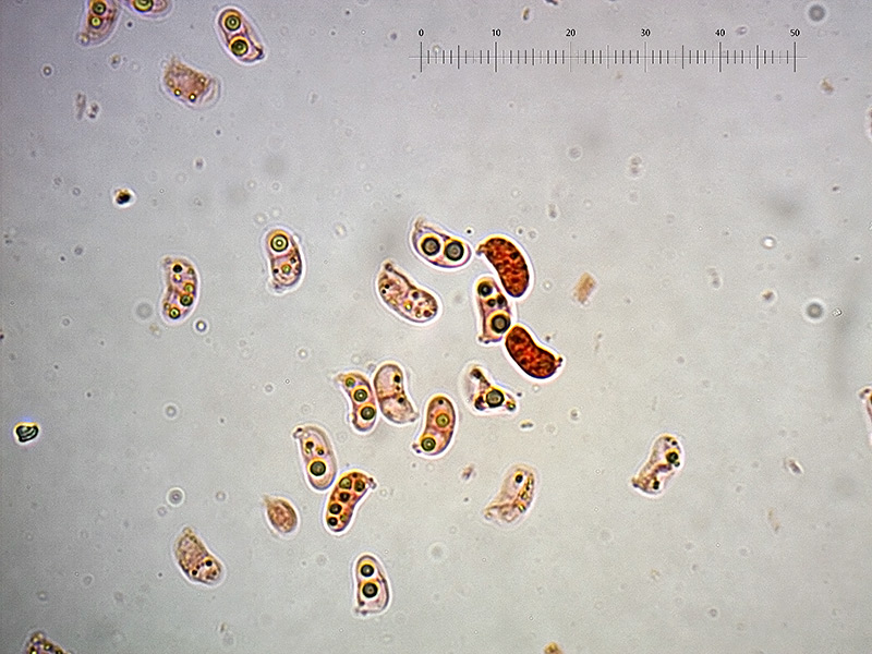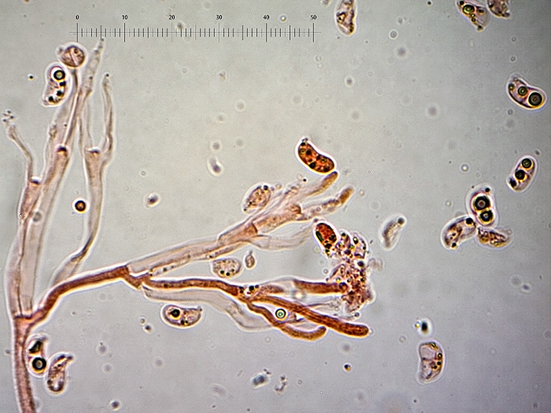 Archivio Micologico Inviato 7 Marzo 2016 Inviato 7 Marzo 2016 Calocera cornea (Batsch : Fr.) Fr. 1827 Tassonomia Divisione Basidiomycota Classe Agaricomycetes Ordine Dacrymycetales Famiglia Dacrymycetaceae Sinonimi Clavaria cornea Batsch : Fr. 1783 Corynoides cornea (Batsch : Fr.) Gray 1821 Calocera cornes (Batsch : Fr.) Fr. 1827 Etimologia Calocera dal greco kalós = bello e kéras = corna, che ha belle corna e dal latino cornĕum, derivato di cŏrnu = corno, l’epipeto specifico è riferito alla forma a corno. Basidioma Comunemente è conosciuto per l’aspetto digitaliforme, ma può assumere anche la forma di corno singolo o con apice a due o tre punte (palmato) o dendroide (ad albero), di piccole dimensioni 10-15 mm di altezza e 1-2 mm di diametro, di colore giallo tuorlo, lucido, alcuni carpofori hanno la zona basale biancastra, traslucida. La parte fertile è distribuita sulla superficie esterna del corno. Circa le modalità di crescita sono stati osservati esemplari singoli, ma anche cespitosi e connati. Carne La carne è di consistenza gelatinosa, elastica, un po’ vischiosa, senza sapore e odore particolari. Habitat Specie saprofita, cresce su ceppi e rami marcescenti nei boschi di latifoglia dall’estate all’autunno. Il ritrovamento in esame si riferisce alla crescita su di un rametto in decomposizione di Quercus cerris (Cerro). Microscopia Spore oblunghe, cilindriche, reniformi, in maggior numero biguttulate, con apicolo evidente, munite a maturità di un setto trasversale, misurate 32 spore, 8,0-10,7 × 4,1-5,4 µm; media 8,8 × 4,4 µm; Q = 1,8-2,1; Qm = 2,0. Osservate anche spore in fase di germinazione. Le spore in massa sono di colore ocra-giallino. Probasidi bisporici con caratteristica forma di diapason o ipsilon (Y). Ife cilindriche 2-3 µm di spessore, settate. GAF assenti in tutti i tessuti esaminati. Commestibilità e tossicità Tossicità dubbia o presunta, insufficientemente conosciuta, da sottoporre a nuove indagini e valutazioni. Osservazioni Nella raccolta oggetto di questo studio sono stati osservati esemplari di diverso aspetto, accanto alla classica forma digitata, cioè il carpoforo cilindrico a forma di corno con apice singolo smussato ed arrotondato, sono stati osservati esemplari dendroidi (a forma di alberello), basidiomi cilindrici con apice a due o tre piccole punte (palmato). Dal punto di vista microscopico sono state osservate spore con un setto ma anche spore in germinazione. Non sono stati osservati GAF. La variabilità morfologica riscontrata ci fa ritenere che solo la convergenza dei vari elementi, quali l’habitat di latifoglia, l'esame macroscopico e microscopico, ci consenta di determinare correttamente questo taxon e di separarlo dalle specie simili. Specie simili Calocera glossoides (Pers. : Fr.) Fr. condivide lo stesso habitat di latifoglia, in particolare la Quercia, che se pur di piccole dimensioni è formata da due parti: uno pseudogambo cilindrico, corto, ed una parte fertile a forma di cono smussato, sagomato, compresso, scanalato-grinzoso longitudinalmente, i carpofori possono assomigliare vagamente a delle morchelle in miniatura. Gli stessi da giovani hanno tonalità gialle, poi giallo-arancio ed infine invecchiando ed asciugando volgono su toni bruno-marroni. Dal punto di vista microscopico si separa per le spore di maggiori dimensioni 12-14(17) × 3-5 µm e con 3 setti a maturità. Calocera pallidospathulata D.A. Reid, cresce su rami e ceppi in decomposizione di conifera e latifoglia, si differenzia per avere già inizialmente colorazioni gialline molto pallide, che presto decolorano su tonalità biancastre, di aspetto traslucido, di piccole dimensioni, ha una forma irregolare, spesso con punte piuttosto arrotondate, a simulare una spatola. Le spore misurano 10-15 × 3,5-5 µm con 1-3 setti. Calocera furcata (Fr. : Fr.) Fr. predilige rami marcescenti di conifera, anch’essa di dimensioni minuscole, presenta basidiomi più claviformi distintamente forcati all’estremità, spore di dimensioni maggiori con 1-3 setti a maturità. Calocera viscosa (Pers. : Fr.) Fr., tipica delle abetaie alpine, predilige tronchi e rametti marcescenti di Peccio (Picea abies (L.) Karst.), di maggiori dimensioni, raggiunge un’altezza 5-8(10) cm e larghezza molto varia, di forma coralloide, di colore giallo, giallo-arancio, con rametti slanciati che terminano all’apice con due o tre corte punte. Bibliografia AA.VV., 2015.Tutto Funghi a cura A.M.I.N.T. 3a edizione, Ed. Giunti. BOCCARDO, F. et al., 2008. Funghi d'Italia. Bologna: Ed. Zanichelli. BREITENBACH, J. & KRANZLIN, F., 1986. Champignons de Suisse. Vol. 2. Champignos sans lames. Lucerna: Ed. Verlag Mykologia. EYSSARTIER, G., & ROUX, P., 2011. Le guide des Champignons France et Europe. Parigi: Ed. Belin. SHIHIROUZU, T., HIROSE, D. & TOKUMASU, S., 2009. Taxonomic study of the Japanese Dacrymycetes. Persoonia 23: 16-34. Doi:10.3767/003158509X468443. [Data di accesso: 09/09/2015]. Fonti Internet FIRST NATURE, 2015. Calocera pallidospathulata www.first-nature.com. [Data di accesso: 09/09/2015]. ROGER MUSHROOM, 2015. Calocera Glossoides. www.rogersmushrooms.com. [Data di accesso: 09/09/2015]. PETR BEŇADIK, 2015. Calocera glossoides. http://botany.cz. [Data diaccesso: 09/09/2015]. ROBERT HANZLÍK[/size], 2015. Calocera glossoides. www.houbareni.cz. [Data di accesso: 09/09/2015]. Scheda di proprietà AMINT realizzata da Mario Iannotti - Revisionata da Tomaso Lezzi. Regione Umbria; Agosto 2015; Foto, descrizione e microscopia di Mario Iannotti. (Exsiccatum MI20150821-01) Foto macro. Microscopia Spore oblunghe, cilindriche, reniformi, in maggior numero biguttulate, con apicolo evidente, munite a maturità di un setto trasversale, misurate 32 spore, 8,0-10,7 × 4,1-5,4 µm; media 8,8 × 4,4 µm; Q = 1,8-2,1; Qm = 2,0. Osservazione in Rosso Congo ammoniacale a 1000×. Osservate anche spore in fase di germinazione. Probasidi bisporici con caratteristica forma di diapason o ipsilon (Y). Osservazione in