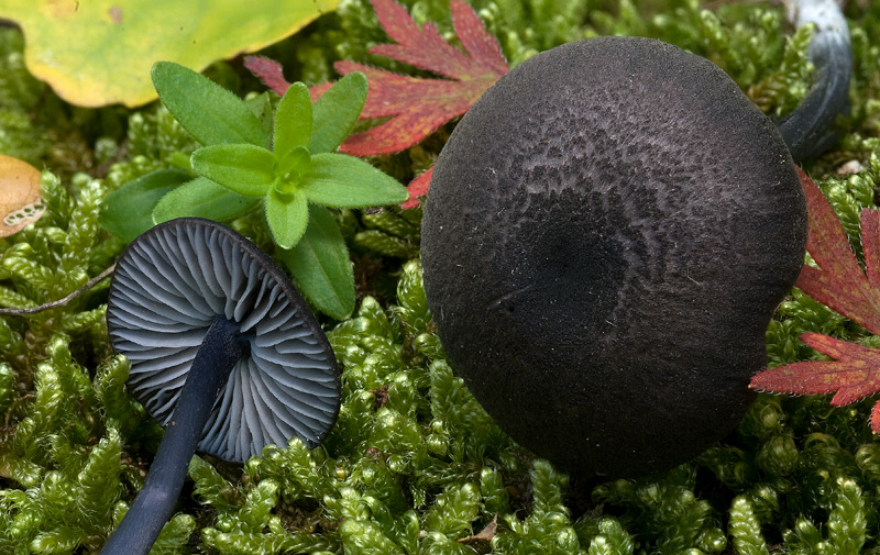 Archivio Micologico Inviato 31 Marzo 2016 Autore Inviato 31 Marzo 2016 Entoloma chalybaeum (Pers.) Noordel.; Regione Lazio; Settembre 2009; Foto di Tomaso Lezzi.Piccolo Entoloma trovato in un prato sotto Quercia su terreno calcareo.Cappello blu scuro con fibrille radiali e piccole scagliette nere soprattutto al disco e nei campioni più maturi, su fondo un poco più chiaro, lamelle azzurrate, con filo appena scuro, difficilmente visibile.Gambo concolore al cappello, base del gambo con micelio bianco. Nessun odore o sapore particolari.Spore 8,2-10,4 × 5,8-7 µm; Q=1,3-1,7 Qm = 1,5; con 5-7 spigoli viste nella proiezione in cui è visibile l'apicolo. Spesso con grande guttula centrale.Filo sterile (senza basidi) con presenza di cheilocistidi clavati.GAF non osservati né nei tessuti della lamella, né in quelli del cappelloCuticola: epicute con pigmento vacuolare e diffuso marrone violaceo, ipocute con pigmento vacuolare oleoso di colore più chiaro.I caratteri che mi hanno fatto pensare a Entoloma chalybaeum sono il cappello e il gambo blu molto scuri, le lamelle azzurrate, soprattutto negli esemplari giovani, il filo leggermente scuro, sterile, la presenza di cheilocistidi e il pigmento vacuolare intracellulare non incrostante.Particolare di lamelle e cappello.Le lamelle col filo leggermente più scuro.Un confornto tra il cappello di un giovane esemplare e quello di un esemplare maturo.Nel primo prevalgono le fibrille radiali, nel secondo le squamette appressate soprattutto al disco.Negli esemplari più maturi le lamelle sono meno azzurrate.Le spore rosa si sono depositate sui fili di una ragnatela.Spore 8,2-10,4×5,8-7 µm; Q=1,3-1,7 Qm=1,5; con 5-7 spigoli viste nella proiezione in cui è visibile l'apicolo. Spesso con grande guttula centrale.Nell'epicute prevale il pigmento disciolto marrone violaceo.Cheilocistidi clavati.Basidi tetrasporici.