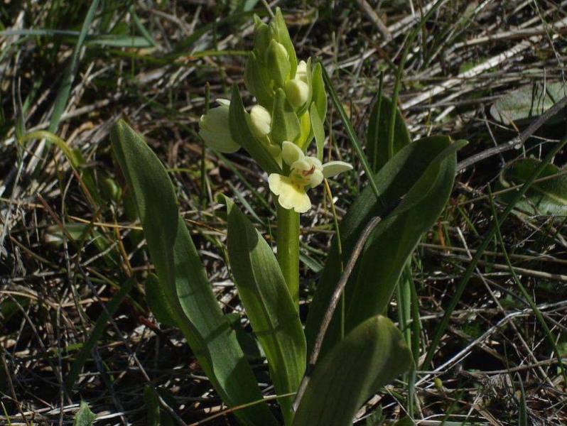 5-9 foglie verdi oblungo-lanceolate, erette, le inferiori distanziate e non riunite in rosetta, le superiori bratteiformi.