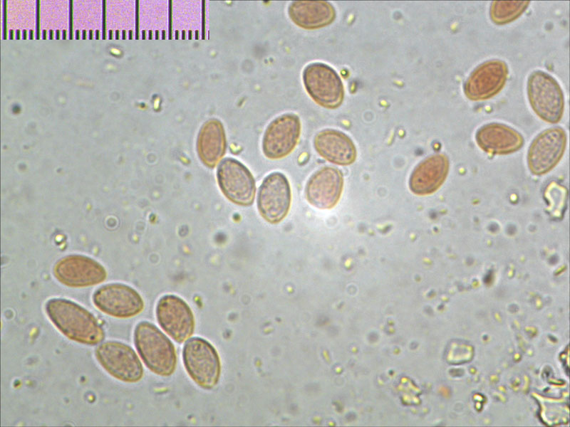 Spore 7,5-10,5 × 4-6 µm lisce, da subfusiformi a irregolarmente ellittiche. Foto di Massimo Biraghi.