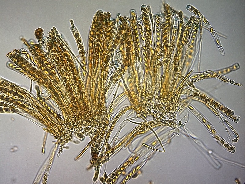 Aschi 100-150 × 8-10 µm, cilindrici-claviformi, ottosporici, aporinchi, leggermente amiloidi all’apice.