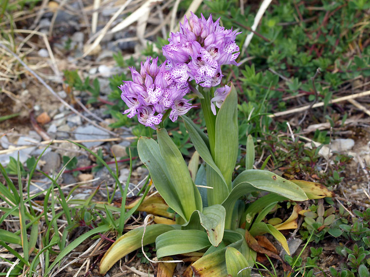 Gruppo Botanico AMINT Inviato 22 Dicembre 2008 Inviato 22 Dicembre 2008 Neotinea tridentata (Scop.) R.M. Bateman Pridgeon & M.W. ChaseSinonimiOrchis commutata Tod.Orchis conica Guss.Orchis tridentata Scop.Orchis variegata All.TassonomiaRegno: PlantaeDivisione: MagnoliophytaClasse: LiliopsidaOrdine: OrchidalesFamiglia: OrchidaceaeNome italianoOrchide screziataOrchide tridentataOrchidea a tre dentiEtimologiaIl nome del genere deriva dall'aggettivo greco neòs = nuovo e dal nome del botanico siciliano V. Tineo, cui è dedicato.Il nome specifico deriva dal latino tri=tre e dens=dente, con riferimento alla forma del casco.DescrizionePianta robusta alta 15-40 cm.FoglieFoglie 4-11 oblungo lanceolate, riunite in rosetta basale, suberette e caulinari abbraccianti il fusto.FioriInfiorescenza densa, globosa, conica, multiflora, con brattee lanceolate e acuminate, di colore verde chiaro con la punta porporina. Fiori piuttosto piccoli, sepali ovato-lanceolati, accuminati, conniventi con i petali a formare un casco, lilacino venato da linee longitudinali porpora; labello trilobo,concolore, ma più chiaro, ai tepali, punteggiato di rosa porpora; lobo mediano più lungo, allargato e bilobato, spesso con un piccolo dente mediano; sperone chiaro, cilindrico, lungo come l'ovario, ricurvo verso il basso.Tipo corologicoEuromediterraneaPeriodo di fiorituraMarzo-giugnoTerritorio di crescitaPresente su tutto il territorio Italiano.HabitatPrati e pascoli magri, cespuglieti e radure boschive, preferibilmente su terreni calcarei.Somiglianze e varietàNeotinea commutata (Tod.) R.M. Bateman Pridgeon & M.W. Chase (presente solo in sicilia) che si distingue per l'ifiorescenza più corta, pochi fiori e cappuccio molto allungato; labello dentellato ai margini, lobi molto larghi.NoteL'impollinazione di questa specie è entomofila, ad opera di imenotteri.Scheda di proprietà AMINT realizzata da Annamaria Bononcini e Gianni Bonini - Approvata e Revisionata dal Gruppo di Coordinamento dell'Area BotanicaLink utiliIndici temi Botanici - Galleria dei Fiori Piante e Frutti dell'Associazione AMINT - Schede delle Orchidee ItalianeNeotinea tridentata (Scop.) R.M. Bateman Pridgeon & M.W. Chase, Regione Toscana, Aprile 2007 - foto di Gianni Bonini