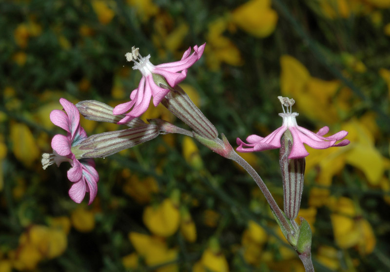 Gruppo Botanico AMINT Inviato 3 Agosto 2012 Inviato 3 Agosto 2012 Silene colorata Poiret (1789) Sinonimi Silene colorata var. stenophylla (Boiss.) Dinsm. (1932) Silene canescens Ten. (1811) Silene bipartita Boiss. (1867) Tassonomia Divisione: Magnoliophyta Classe: Magnoliopsida Ordine: Caryophyllales Famiglia: Caryophyllaceae Nome italiano Silene colorata Etimologia L'epiteto generico, Silene, è di etimo incerto. Potrebbe derivare greco Σειληνός (Seilenós) = Sileno (in latino Silenus), che la mitologia greco-antica ricorda come padre adottivo e compagno di Bacco. Sileno viene spesso raffigurato sotto sembianze umane ma anche con attributi animaleschi come orecchie, coda e zoccoli equini, e coperto di schiuma dovuta alla vinificazione. Forse quest'ultima caratteristica può giustificare la scelta dell'epiteto generico: infatti molte specie di Silene sono cosparse da una tipica secrezione vischiosa che può ricordare una sorta di schiuma. Oppure può derivare sempre da Sileno che viene raffigurato anche con una gran pancia rotonda: in tal caso ricordando la tipica forma a palloncino dei fiori di molte specie di Silene. Altra origine può riscontrarsi nella parola greca σίαλον (sialon) = saliva, sputo; in riferimento alla tipica secrezione vischiosa e attaccaticcia secreta dal fusto di molte specie di Silene. L'epiteto specifico è stato scelto per sottolineare i suoi bei colori. Descrizione Pianta erbacea annuale con radice gracile fittonante e fusti eretto-ascendenti, le foglie, distiche, sericee e di colore verde, hanno forma spatolata o lineare. L'infiorescenza è una cima unipara, le brattee sono di forma ovata, il calice è di colore verde, pubescente, in special modo sulle nervature che sono di colore violetto ed ha denti di forma ottusa con ciglia ai margini, i fiori sono pentameri coi petali profondamente bipartiti di colore rosa, raramente bianchi, con fauce ricoperta da squame che formano una corona dentata di colore bianco, 10 stami e 3 stili. Il frutto è una capsula ovale contenente semi piani con margine ondulato. Fiorisce da aprile a giugno, a livello del mare su zone sabbiose, presente solamente in Veneto, Emilia Romagna, Toscana, Abruzzo, Campania, Puglia, Calabria, Basilicata, Sicilia e Sardegna, segnalata per errore in Friuli Venezia Giulia. Periodo di fioritura, presenza, distribuzione in altezza Silene colorata Poiret (1789); Regione Lazio, 0 m s.l.m.; Aprile 2006; Foto di Mauro Cittadini.