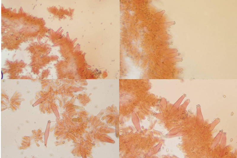 Archivio Micologico Inviato 26 Agosto 2019 Inviato 26 Agosto 2019 Inocybe pseudoreducta Stangl & Glowinski 1981 Tassonomia Divisione Basidiomycota Classe Agaricomycetes Ordine Agaricales Famiglia Inocybaceae Foto e descrizioni Inocybe di media grandezza (fino a 4,5 cm) di colore bruno, color cioccolata, con centro bruno scuro; rivestimento pileico unito al centro, finemente fibroso altrove; con l'età tendente a lacerarsi in squame e mostrare la carne sottostante piu chiara. Lamelle subito biancastre/grigiastre, poi ocracee con riflessi grigiastri, infine brunastre, adnate. Gambo interamente color brunastro/rossiccio con fiflessi rosati solo all'apice, interamente pruinoso e terminante con un evidentissimo bulbo marginato bianco. Carne biancastra nel cappello, carinicino-ocracea nel gambo,bianca nel bulbo; odore acido, pungente come di Lepiota cristata. Habitat, parco cittadino con presenza,sia di latifoglie che conifere. Microscopia Spore liscie, ovoidi, leggermente amigdliformi, abbbastanza regolari nella forma, apice leggermente acuto in alcune; dimensioni 7,5-9,5 × 4,5-6 µm; misura media 8,2 × 5 µm. Pleurocistidi da fusiformi a ventricoso-fusiformi da 50 a 70 × 15-20 µm (rarissimi quelli oltre 70 µm × meno di 15 µm di larghezza) con parete spessa fino a 3 µm e debolissimamente reagente all'ammoniaca, reazione quasi negativa. Cheilocistidi simili ai pleurocistidi. Caulocistidi presenti fino all'estrema base del gambo,di varie forme e con paracistidi, soprattutto alla base del gambo. Svizzera; Ottobre 2015; Foto e microscopia di Roberto Cagnoli. Spore. Caulocistidi alla base del gambo. Cheilocistidi. Pleurocistidi in ammoniaca.